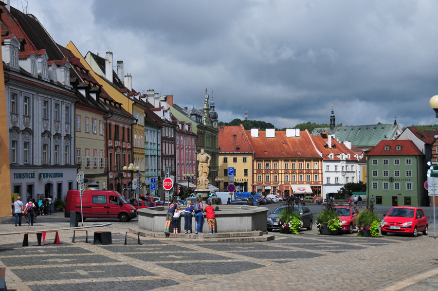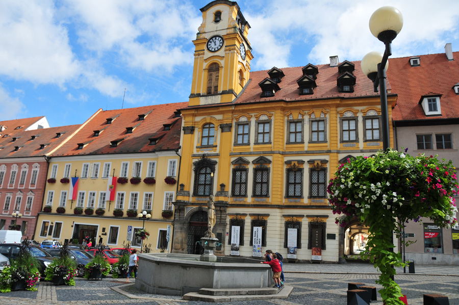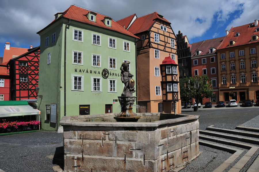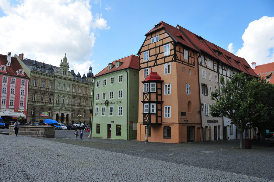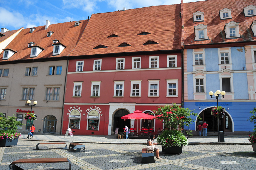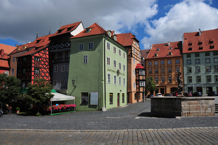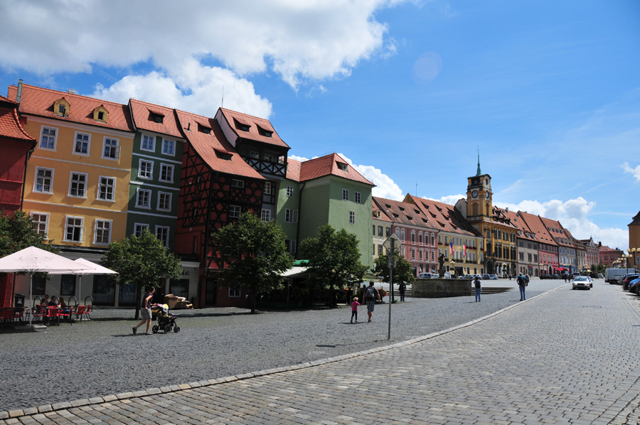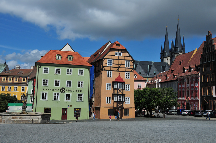 Der Stöckl oder Marktplatz von Georg von Podiebrad selbst verweist auf den Besuch des tschechischen Königs, der hier in den Jahren 1459 - 1467 weilte, um die damaligen Konflikte unter den Böhmen und den Reichsfürsten zu schlichten. Für die steinernen, ursprünglich gotischen Häuser auf dem Marktplatz sind ihre engen Stirnseiten und vor allem mehrstöckige, hohe Dächer charakteristisch, die früher zur Schau gestellt worden sind, damit sie den Reichtum der mittelalterlichen Stadt Eger betonen. Die Kauf- und Geschäftsmänner - die ursprünglichen Besitzer dieser prächtigen Häuser - nutzten nämlich zu der Zeit die Dachbodenräume als Lager für ihre Ware. So wurden diese gleich und unmittelbar zur Schau gestellt, das umso höher das Dach war, desto erfolgreicher und reicher der Kaufmann war.