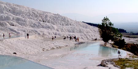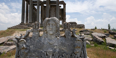 Hierapolis - Die Ruinen des antiken Hierapolis befinden sich entlang der 1200 m langen und 6m breiten säulenbestandenen Strasse, die sich auf dem Plateau über den Travertinterrassen von Pamukkale in Nordsüdrichtung erstreckt.