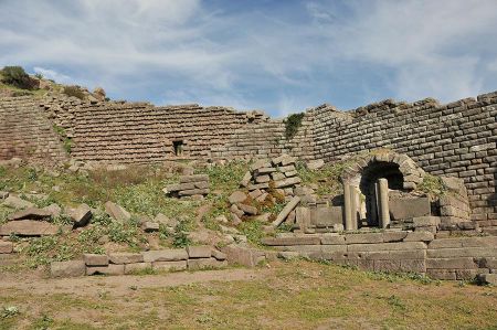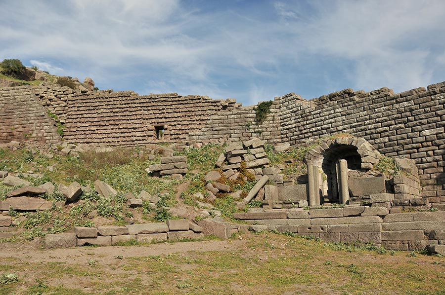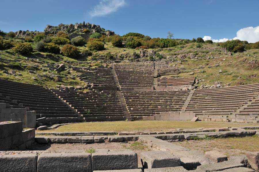 Noch weiter unten erkunden wir das Theater, das in typischer Art und Weise in den Hang hineingebaut worden ist. Auch wieder einmal typisch ist der Ort der Ruine, man hätte kaum einen besser geeigneten Platz finden können. War das angebotene Schaustück zu monoton, entschädigte der Blick in die Landschaft und auf die Insel Lesbos den Theaterbesucher.