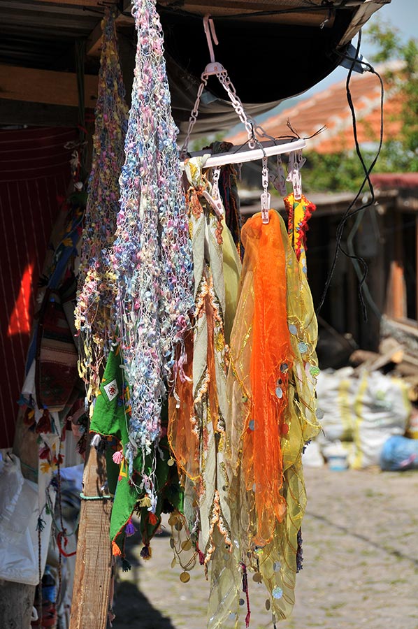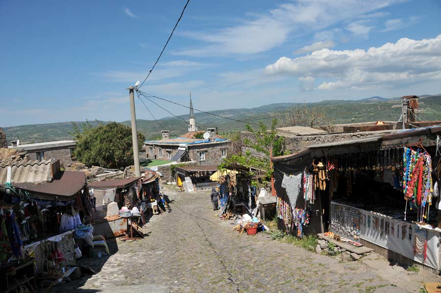 Auf der Küstenstraße den Berg erklimmend, erreichen wir zunächst das Dörfchen Behramkale, das ist auch der häufig genannte türkische Name der Stadt Assos, von wo aus wir den ehemaligen Stadtkern betreten wollen. Völlig auf den Tourismus ausgerichtet, werden von den Einheimischen bestickte Tischdecken und allerlei sonstige Handwerkskunst zu kleinen Preisen angeboten. Es geht recht steil den Berg hinauf, immer den Windungen der engen Dorfstraße folgend.