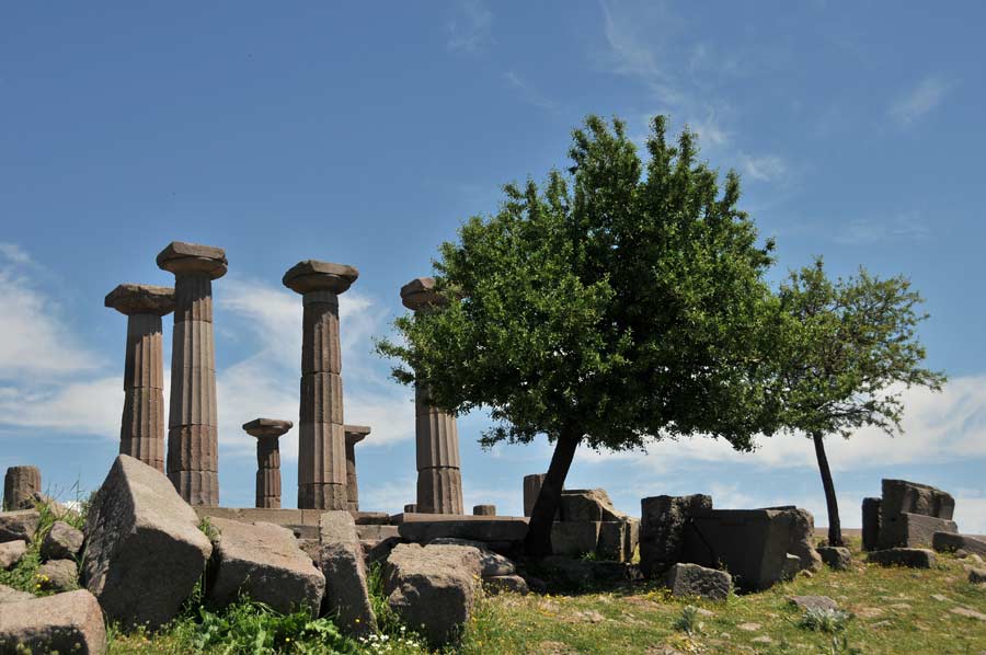 Uns ziehen die Ruinen des dorischen Tempels der Athena an der höchsten Stelle des Stadtberges allerdings magisch an. Der Athena Tempel wurde hier zwischen 530 und 520 vor Christus errichtet. Einige der wieder stehenden Säulen bestehen aus einheimischem Trachyt, die jedoch im Altertum mit weißem Marmorstuck überzogen waren. Der Athena Tempel von Assos ist der einzige bekannte archaische Tempel dorischer Ordnung in Kleinasien.
