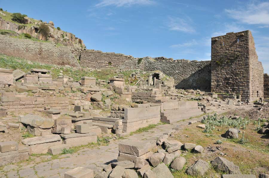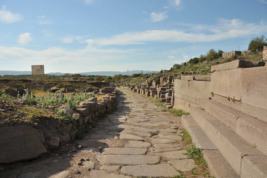 Im Stadtgebiet, das von hier oben recht gut überblickt werden kann, sind an den Hängen zwischen Agora und Meer, heute noch die Agora mit auf zwei Seiten umgebenden Hallen, das Buleuterion, das Gymnasion, das Theater und eine römische Therme recht gut erhalten bzw. ausgegraben und gesichert worden. Auch der Blick hinüber zur griechischen Insel Lesbos ist faszinierend und einzigartig. Die Stadtmauer ist in ihrer Ausdehnung von 3 km mit Türmen und Toren in großen Teilen noch sehr gut erhalten und in ihrem Verlauf von hier oben gut zu erkennen. Sie entstand in vielen Bauphasen vom 3. Jahrhundert v. Chr. bis in byzantinische Zeit. Daneben sind Reste einer wohl noch archaischen Stadtmauer sichtbar. Gut erkennbar auch die sich außerhalb der Stadtmauer liegende gut erhaltene Nekropole mit Grabbauten und unendlich vielen Sarkophagen.