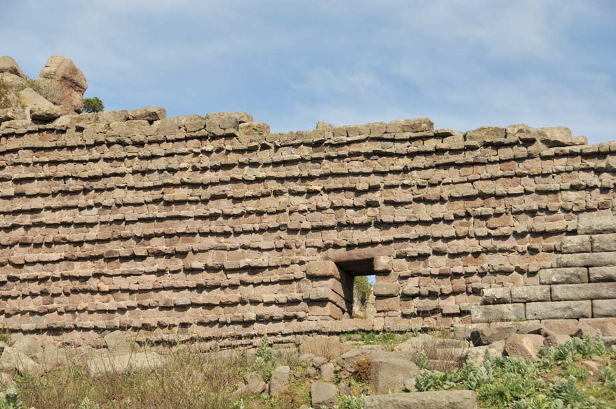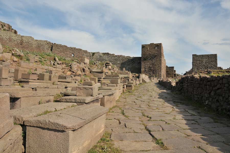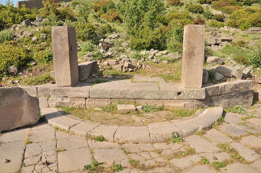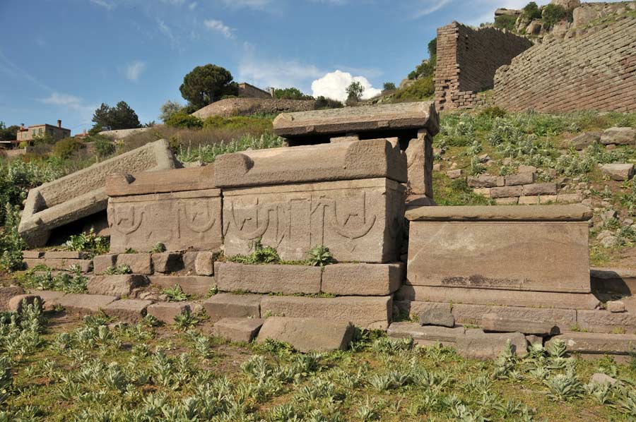 Trotz einiger Versuche, direkt zur Agora und zum Theater hinab zu steigen, finden wir keine wirklich begehbare Passage und beschließen den Rückweg durch das Dorf Behramkale anzutreten. Uns reizt das Betreten der Stadt durch die mächtige Toranlage und die etwa 8 Meter hohe Stadtmauer ganz besonders und so gelangen wir über das Teilstück einer gepflasterten Straße, die von einer unglaublicher Anzahl von Sarkophagen links der Straße begleitet wird. Links vor dem Stadttor finden wir eine hallenartige Konstruktion, die dreiseitig eine steinerne Sitzbank aufweist, fast wie Wartehäuschen. Ob sich hier ankommende Reisende niederlassen konnten, die vor dem Nachts verschlossenen Stadttor warten mußten?