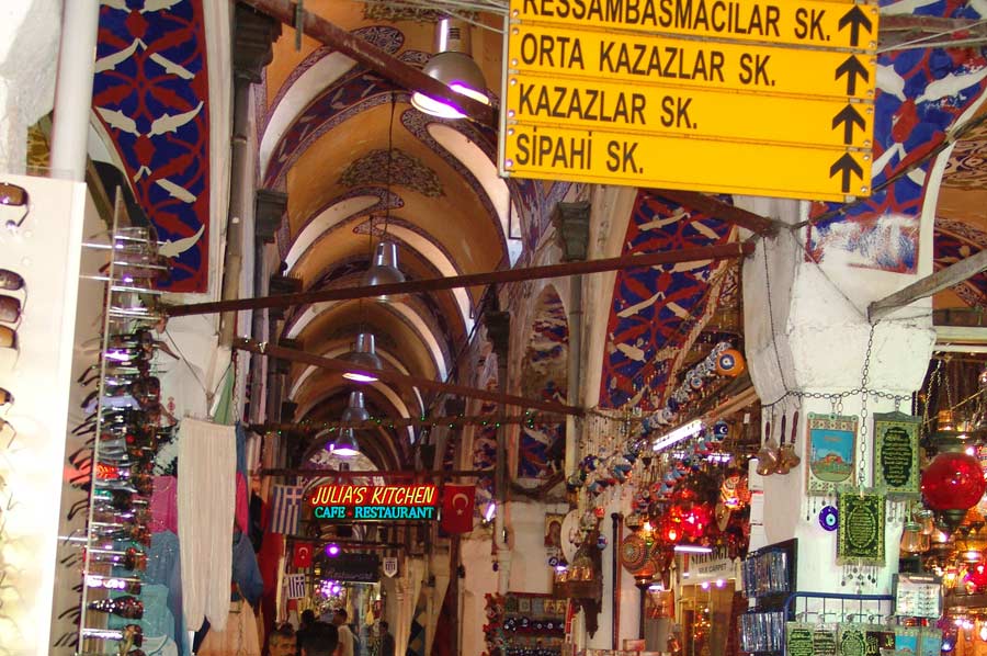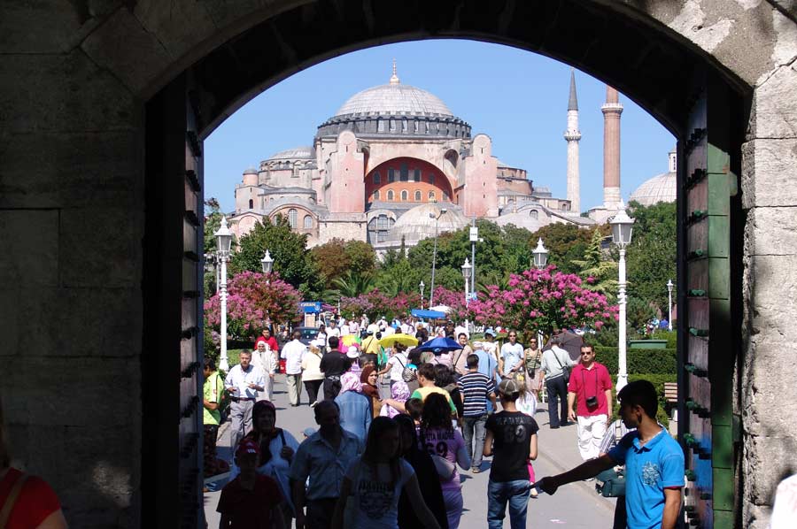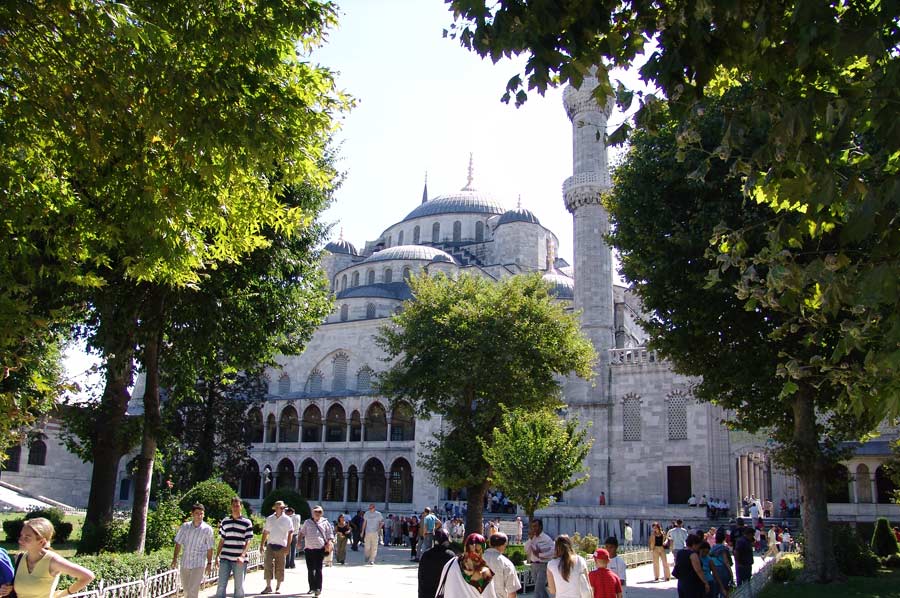 Quer durch den Park gehend, erreichten wir an seinem Ende den Sultanahmet Bereich, der den historischen Mittelpunkt Istanbuls bedeutet. Hier liegen der Topkapi Palast, die Hagia Sophia, die Blaue Moschee (Sultan Ahmed Moschee), das Hypodrome, der versunkene Zisternen Palast (Basilika Zisterne), das Archäologische Museum und der Große (Überdachte) Basar eng zusammen.