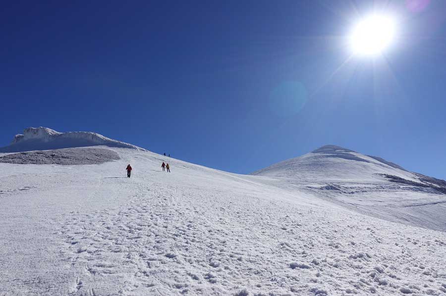 Bei 4000 Metern endet der Aufstieg. Das passt mir gut. In der letzten halben Stunde sind mir allerlei Wehwehchen gehörig auf die Nerven gegangen: ein alter Bruch an der Ferse, mein Oberarm schmerzt vom Stocknachziehen, irgendetwas rumort im Bauch. Der Rückweg ist dafür ein echter Schneespaß! Übermütig rutschen wir unter großem Gejohle über den Schnee bergab.