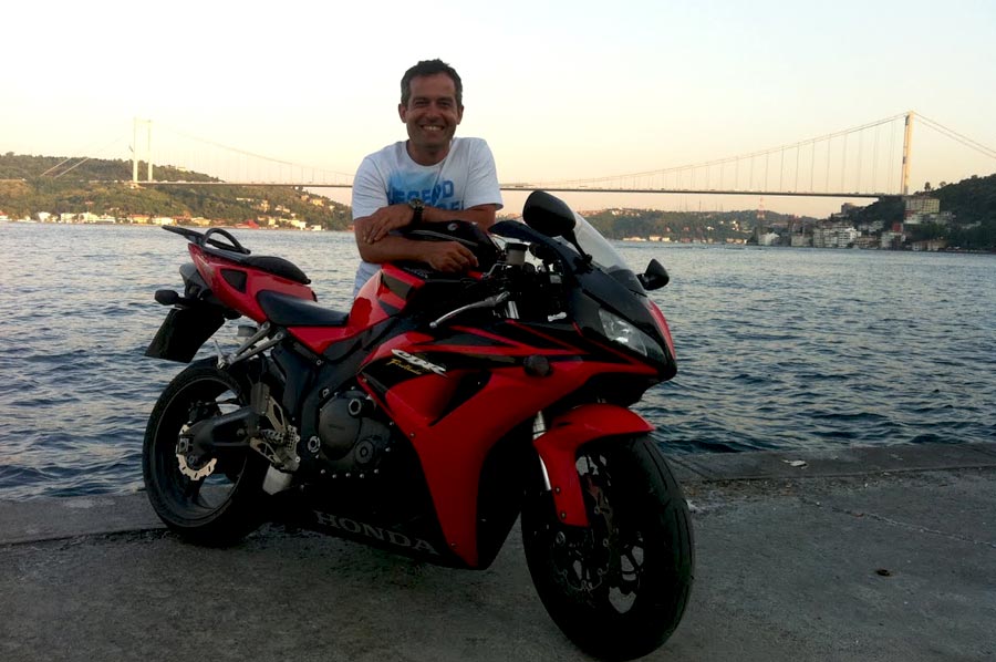 Wieder einmal in Istanbul / Europa angekommen, entspannten wir uns in Bakirköy am Ufercafe bei leckerem Zitronensaft. Dann fuhren wir zurück in die Wohnung meiner Eltern in Osmaniye, wo wir unser gesamtes Gepäck und die Krads sichteten und ordneten. Am nächsten Tag starteten wir den letzten gemeinsamen Ausflug mit allen Krads, da Metins Leihmaschine am kommenden Morgen übergeben werde musste. Die Tour ging entlang des Bosporus bis nach Sariyer. Trotz des grausamen Verkehrs haben wir viel erlebt: Kühe auf der Fahrbahn, die sich im Schatten abkühlten, herrliche Aussicht auf die beiden Bosporusbrücken, Mittagessen auf dem Sahin Tepesi, Obst beim Straßenverkäufer gekauft und unterwegs genascht, Savas wurde leider am Oberarm von einer Biene gestochen, was sich später entzündete und ihn die restlichen Tage beschäftigte (allergische Reaktion).
