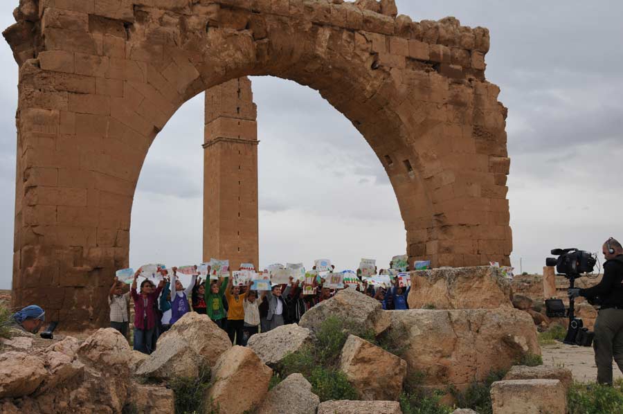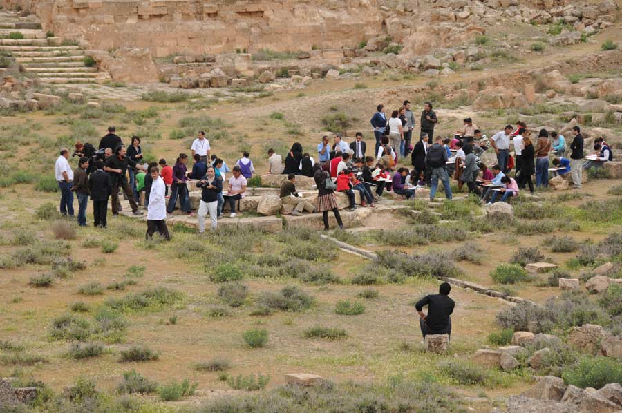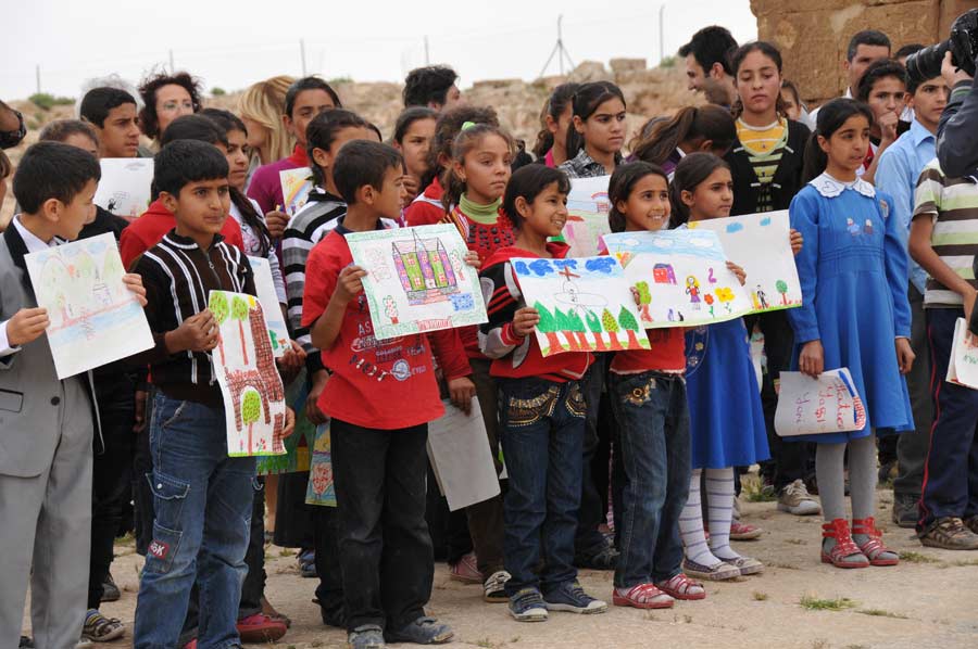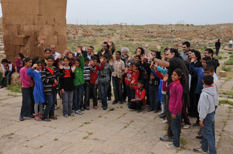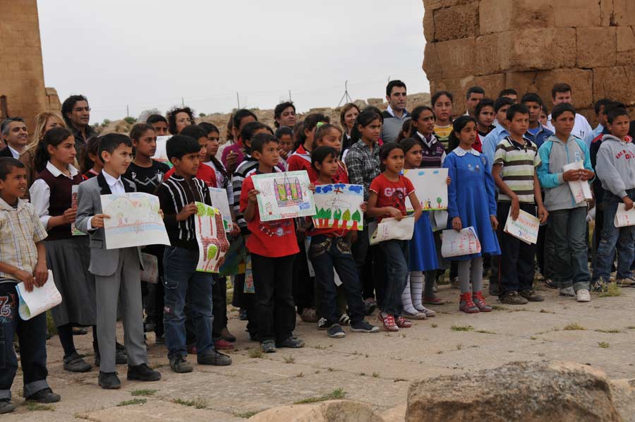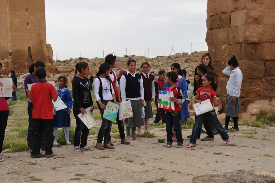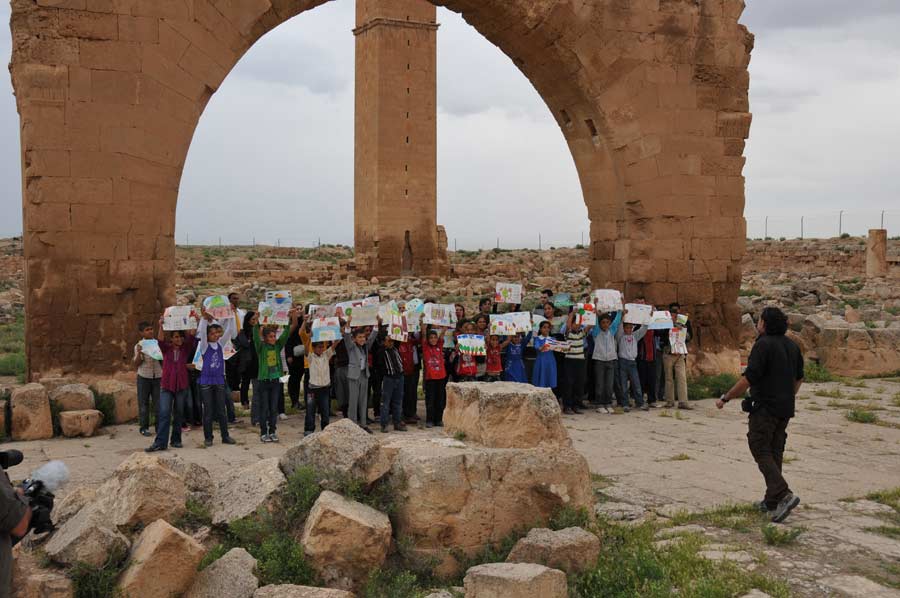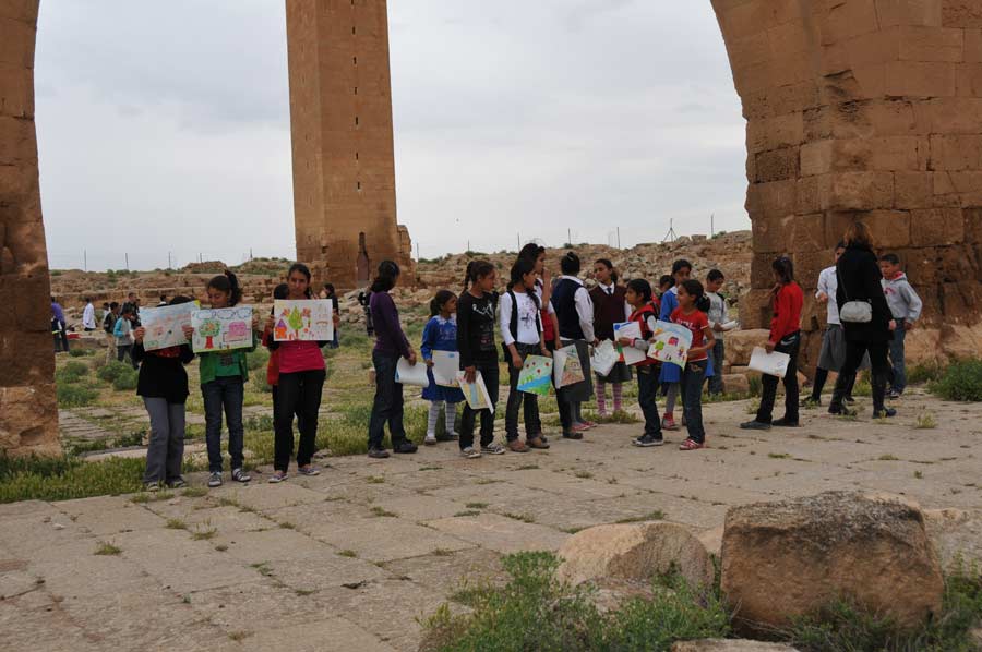 Wir hatten ausgiebig Zeit und Gelegenheit mit den Nachwuchskünstlern in Harran, den Profis aus Istanbul und dem Vali Nuri Okutan zu sprechen, über die Motivation der Künstler zu dieser Tour zu erfahren und selbstverständlich auch einige Details zu den mitgebrachten Bildern. Es war schon spannend, den Kindern bei der Erstellung ihrer Bilder, inspiriert durch die historischen Ruinen von Harran, die gerne und dankbar den Anweisungen und Hilfen von Prof. Mehmet Mahir und Ahmet Günestekin folgten. Begeistert arbeiteten Sie mit farbigen Malstiften und Tusche an den unterschiedlichsten Motiven, immer von Kamera und Fotografen umringt. Es war schon erstaunlich mit welcher Ruhe und Gelassenheit gearbeitet wurde. Am Ende versammelten sich Schüler und Lehrmeister unter dem Eingangsportal zu einem Abschlussfoto, wobei die Schüler ihre Bilder hoch in die Luft hielten. Wir nutzten den Aufenthalt natürlich auch, noch schnell einige Fotos der antiken Bibliothek zu machen.