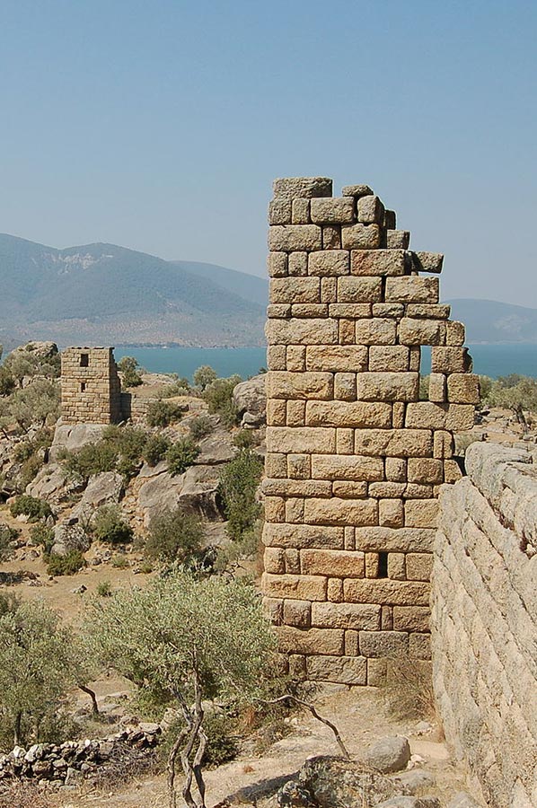 Der Zusatz "am Latmos" wurde gewählt, um sie von anderen antiken griechischen Orten mit dem Namen Herakleia zu unterscheiden. Quadratische und rechteckige Steinmauern mit einer Länge von 6,5 km und 65 Türmen umgeben das antike Herakleia (die beiden Herakleia-Fotos von Wolfgang Glock).