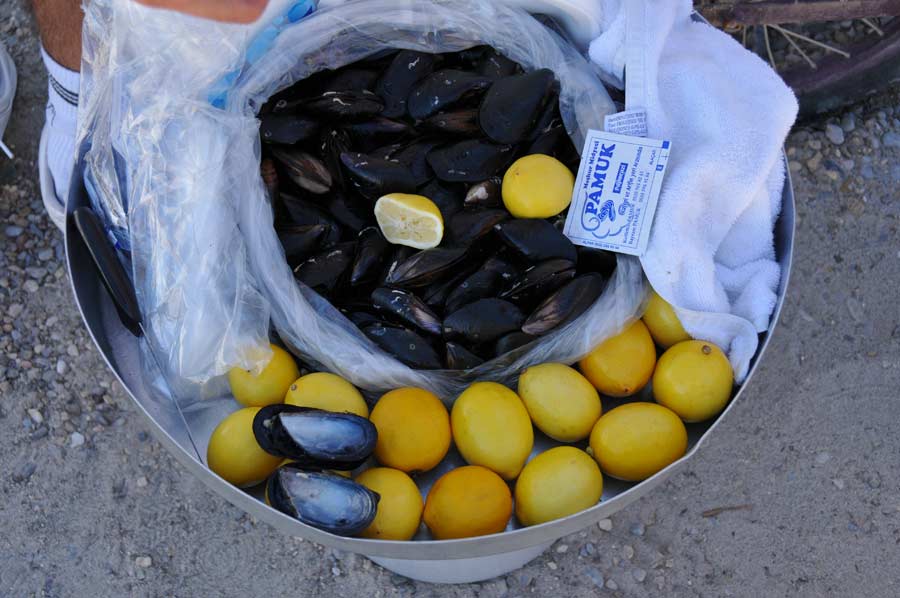 Nun genug der Theorie und ab ins nasse Vergnügen. Als kleine Stärkung, auch am Strand von Alacati, sind die Miesmuscheln mit Zitrone sehr zu empfehlen.