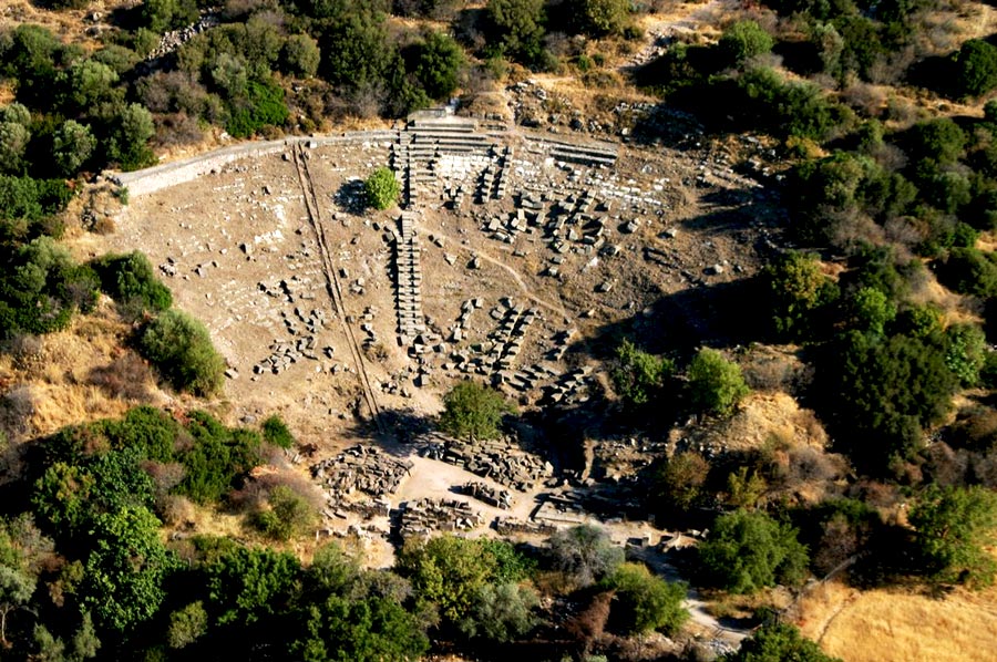 Wenig später sitzen wir erneut im Auto, denn unsere Fahrt soll uns noch nach Erythrai führen. Wir fahren die wenigen Kilometer zurück zur Landstraße 300 und auf derselben dann bis Uzunkuyu, wo wir nach rechts in Richtung Kadovacik abbiegen. Nahe des Dorfes Ildir liegt das antike Erythrai, das später auch mit Litri bezeichnet wurde. Auch Erythrai war Mitglied im Bund der Ionischen Städte, geriet ebenfalls im Wechsel unter persische oder athenischer Herrschaft. Mit dem Untergang des pergamesischen Reichs wurde auch Erythrai als freie Stadt (civitas libera) in die Provinz Asia des Römischen Reichs aufgenommen.