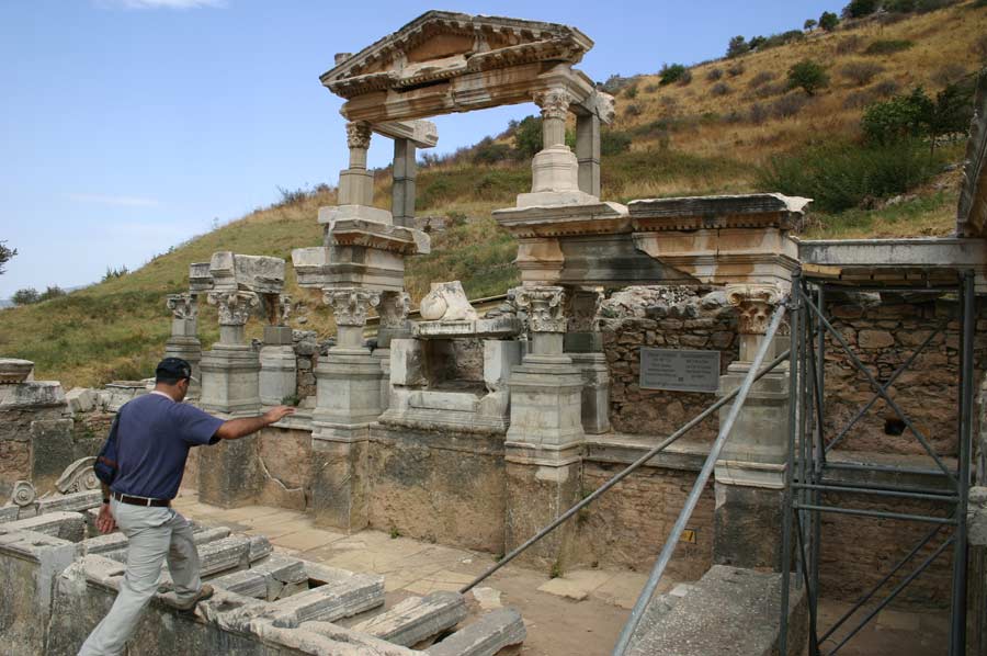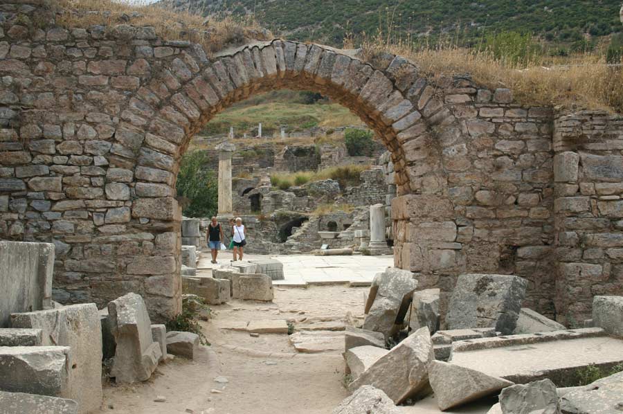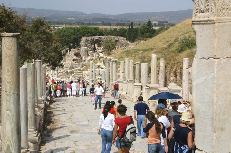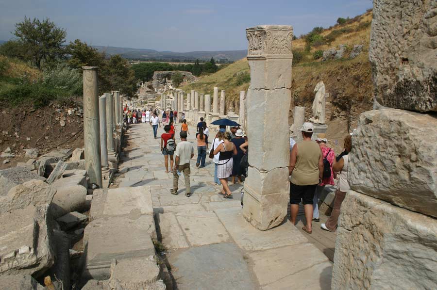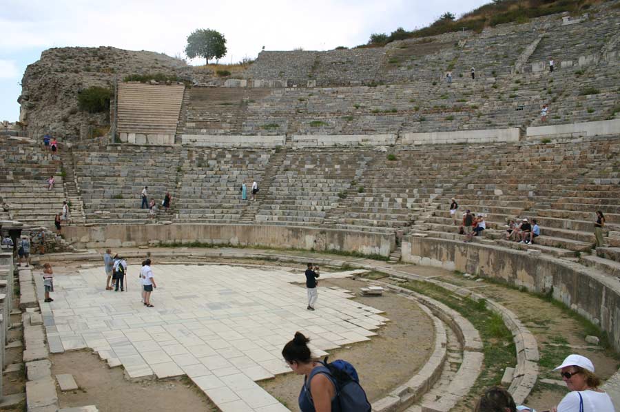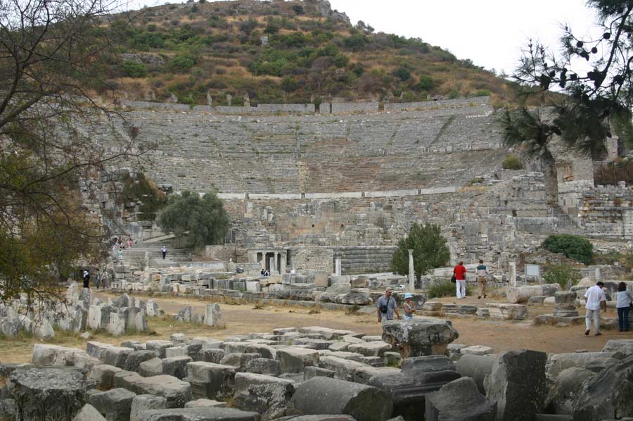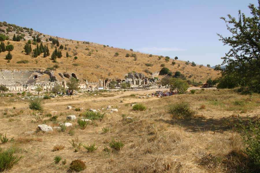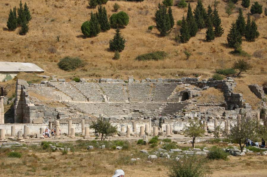 Der Höhepunkt des Besuches der antiken Stadt ist die Besichtigung des großen Theaters. Von den oberen Sitzreihen hat man einen prächtigen Blick über die marmorgepflasterte Hafenstraße, die Arkadiane, zum ehemaligen Hafen von Ephesos. Das Theater wurde renoviert, so dass in den Sommermonaten Konzerte stattfinden können. Wenn das Theater bei diesen Vorstellungen bis auf den letzten Platz gefüllt ist, gehen die Gedanken zurück an die Zeit des Apostels Paulus, als die Stimmung auf den Rängen nicht so friedlich war. Heute ist etwa ein zwanzigstel des Gebietes der antiken Stadt freigelegt. Wer bis zu den oberen Rängen des Theaters hinaufsteigt und einen Blick über das heutige Ausgrabungsfeld wirft, erhält einen Eindruck von der gewaltigen Ausdehnung der antiken Stadt Ephesos.