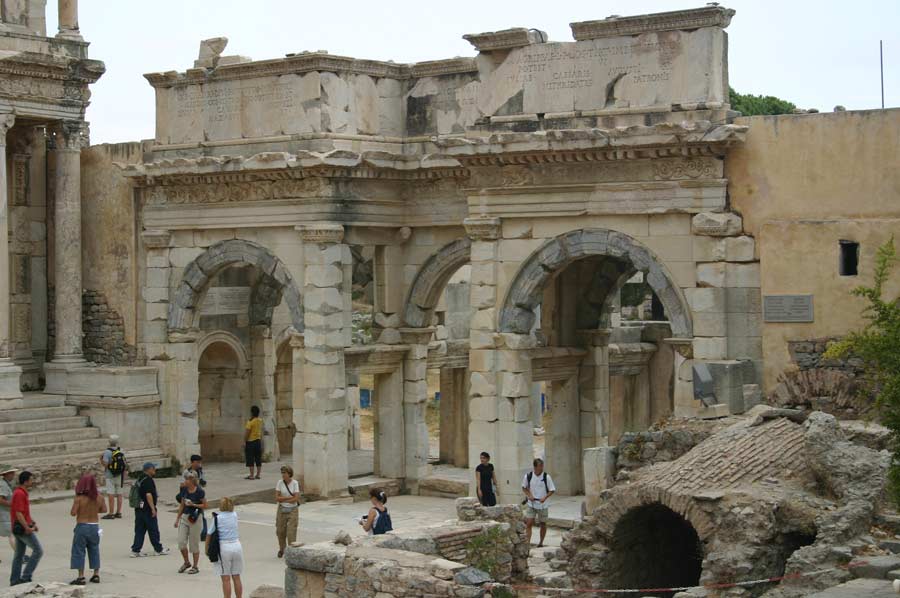 Bei der wieder aufgebauten Fassade der Celsusbibliothek endet die Kuretenstraße. Hinter der Fassade der Celsusbibliothek sind auf Schautafeln - auch in deutscher Sprache - die Geschichte der Bibliothek sowie der antiken Bautechniken erläutert. Von der Celsusbibliothek bis zum großen Theater geht man am unteren Marktplatz entlang auf der Marmorstraße, einer ehemaligen Säulenarkadenstraße.