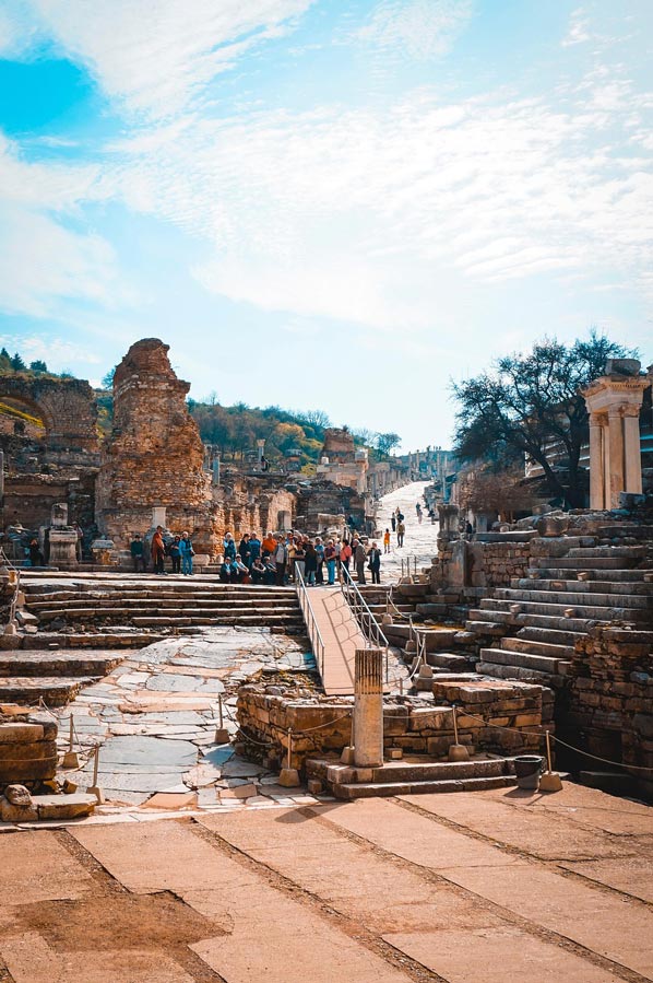 Anschließend kommen Sie zum Bad von Varius, zwei Tempel in einem Rechteck mit Säulen an drei Seiten, der heilige Weg, der mit dem Weg Curetes verknüpft ist, einer imposanten Brunnenanlage, dem Monument von Memmius, der Prachtstrasse, die das Monument und die Celsus Bücherei verbindet, die Brunnenanlage von Trajan an der Prachtstrasse, der Brunnen von Hadrian mit dem Bad des Scholastika rechts dahinter mit gegenüber liegenden antiken Häusern, die für ein extra Entgeld besichtigt werden können.