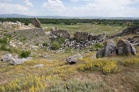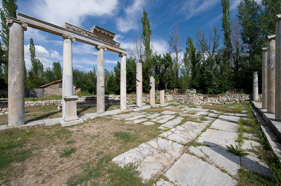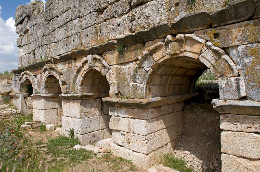 Von recht ungewöhnlicher Bauart sind Stadion und Theater errichtet, die miteinander verbunden sind. Für römische Architektur eine ungewöhnliche Konstellation. Noch dazu lassen sich einzelne Bauphasen im Theater recht deutlich erkennen. Aus Aufzeichnungen weiß man, das sich besonders einige reiche Familien um den Ausbau der Stadt bemüht haben, hierzu zählt auch Ulpius Appuleianus Flavianus und dessen Sohn Ulpius Appuleius Eurycles. Eurycles war auch Abgesandter zum Panhellenion in Athen, das Hadrian eingerichtet hatte. In dieser Zeit entstand ferner eine große Bad- und Gymnasion-Anlage sowie eine wohl dorthin führende Wasserleitung. Weitere öffentliche Bauten waren ein Rundbau, der als Macellum (Marktgebäude) diente und an dem eine Kopie des Höchstpreisedikts von Diokletian angebracht war.