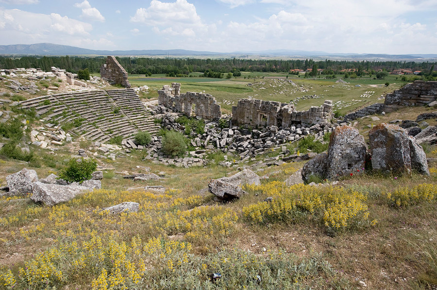 Allein beim letzten großen Erdbeben gab es 1100 Todesopfer. Von Afyonkarahisar hatten wir, während unserer Reise die D 650 nutzend, wir die Ebenen des anatolischen Hochlandes auf etwa 930 Metern Höhe über NN passiert, als wir auf die Hinweisschilder zur antiken Stadt von Aizanoi stießen. Bereits aus der etwa 5.000 jährigen Geschichte der Stadt Kütahya ist bekannt, dass es auch hier ein Wechselspiel unterschiedlichster Bevölkerungsgruppen gegeben hat. Neben den Hethitern und Phrygern waren die Perser und Makedonier hier genauso sesshaft geworden wie später die Römer, die Byzantiner, das Sultanat der Seldschuken, die Armenier, die Griechen, die Germiyan und die Osmanen.