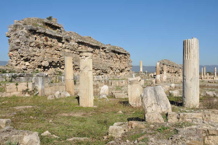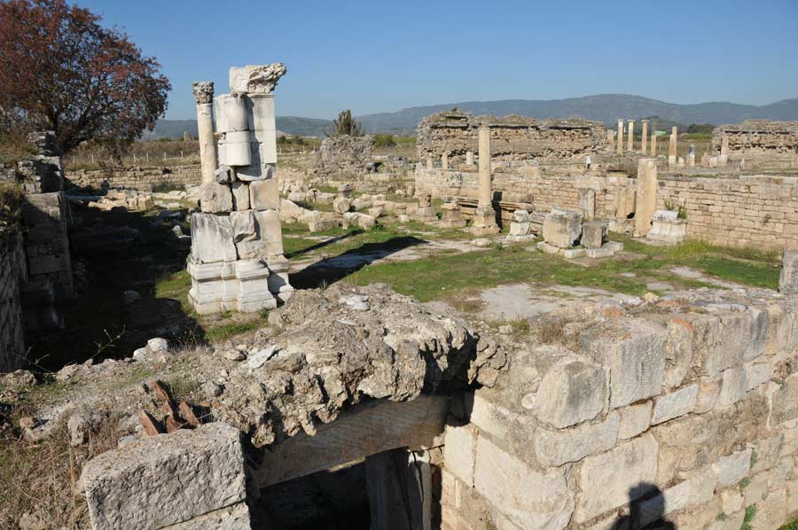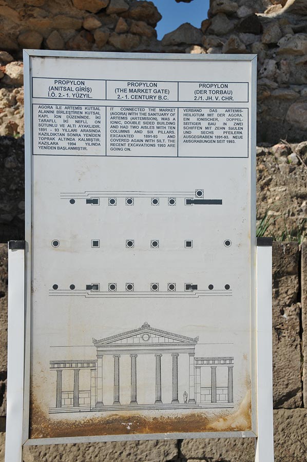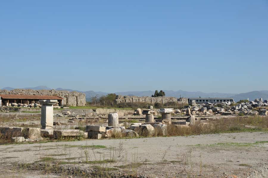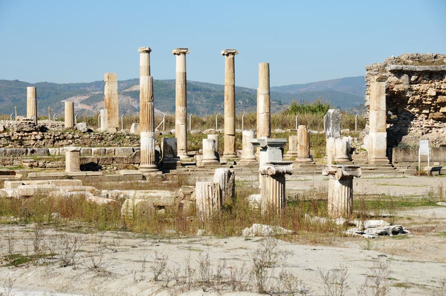 In der weitläufigen Ebene des Flusses Mäander, der im türkischen Büyük Menderes genannt wird, sind die riesigen Reste der Tempelfundamente und Säulenreihe noch als gewaltige Trümmerhaufen zu erkennen. Auch Reste der ehemaligen Stadtmauer sind noch vorhanden.