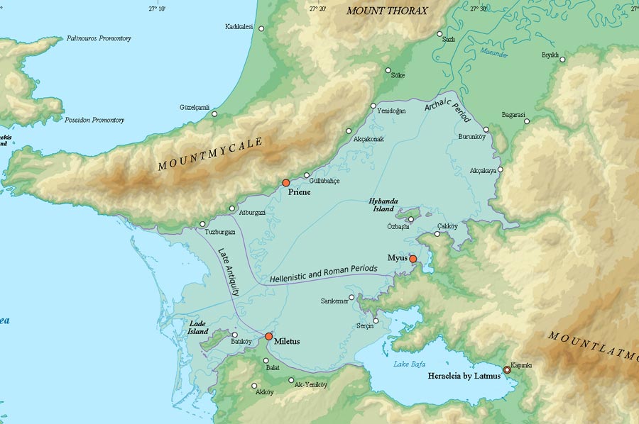 Was als großes Glück für die Siedler des Schwemmlandes neben dem Fluss war, führte an der Mündung in die Ägäis allerdings zur kompletten Versandung riesiger Flächen und damit zum Verlust wirklich wichtiger Hafenstädte der antiken Zeitrechnung. Bei der Betrachtung der eingefügten Karte werden Sie schnell die eingezeichneten Hafenstädte von Milet und Priene finden, die wichtige hellenistische Häfen waren. Auch der heutige Binnensee Bafasee war um die Zeitenwende nur eine Meeresbucht, die nach und nach bis zum 4. Jahrhundert durch Versandung vom Meer abgetrennt wurde. Heute weit ab vom Meer gelegen, bedeutete die Versandung das Ende der Hafenstädte und damit einhergehend der Untergang einstmals blühender Metropolen.