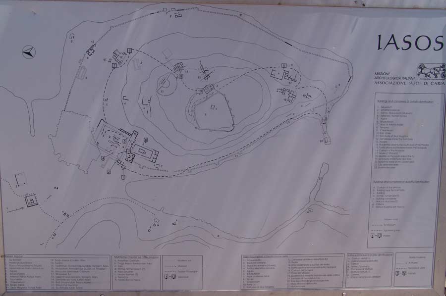 Von Euromos in Richtung Milas fahrend, biegt man nach rechts in Richtung des Dorfes Kıyıkışlacık ab und folgt der Strasse über den Höhenzug. Im Ort angekommen gelangt man bis an den natürlichen Hafen und erkennt links bereits die ersten Ruinenfelder der antiken ionischen Stadt Iasos. Ursprünglich war Iasos auf dem vor der Küste liegenden Inselberg errichtet worden, da es dort einen natürlichen Hafen mit enger Einfahrt gab. Durch Veränderungen der Oberflächenstruktur, Ansandungen und menschlichem Zutun bildete sich allerdings eine Verbindung zum Festland, so das heute eine Strasse direkt bis in den Ort führt.