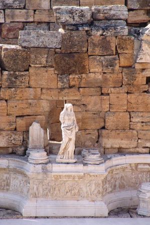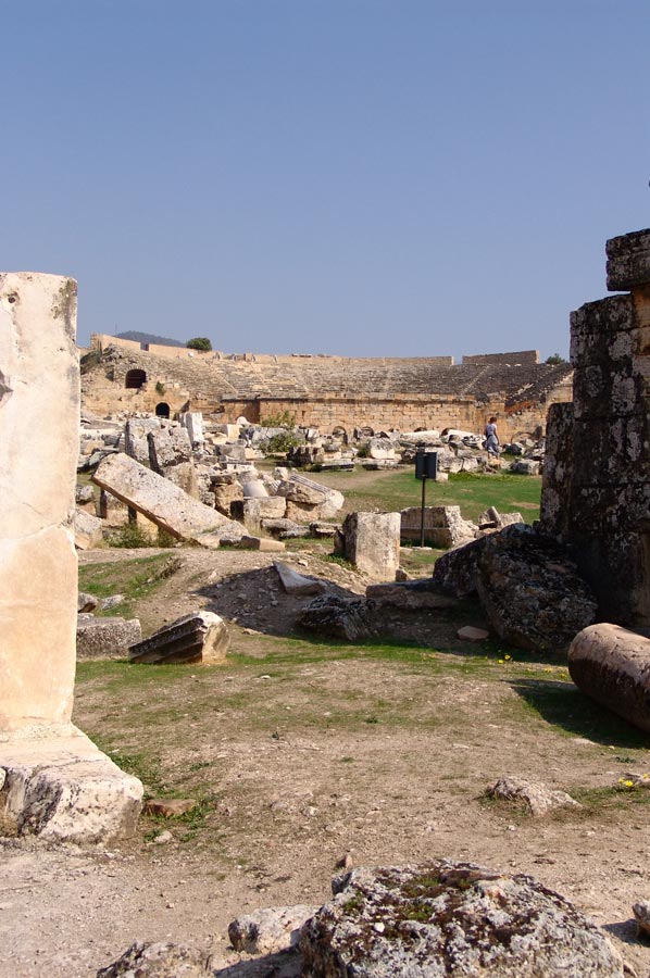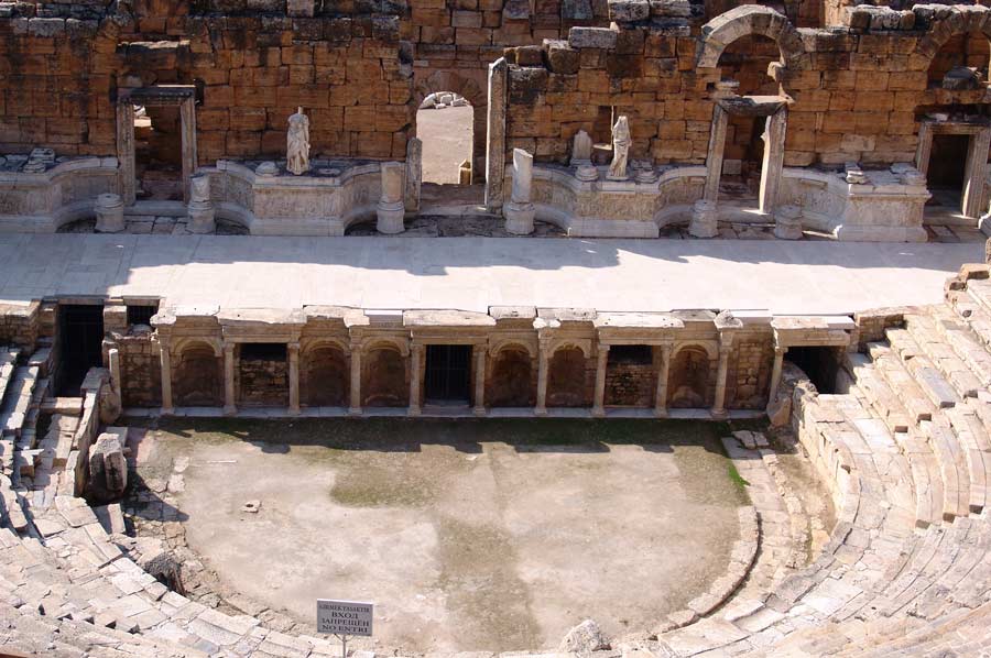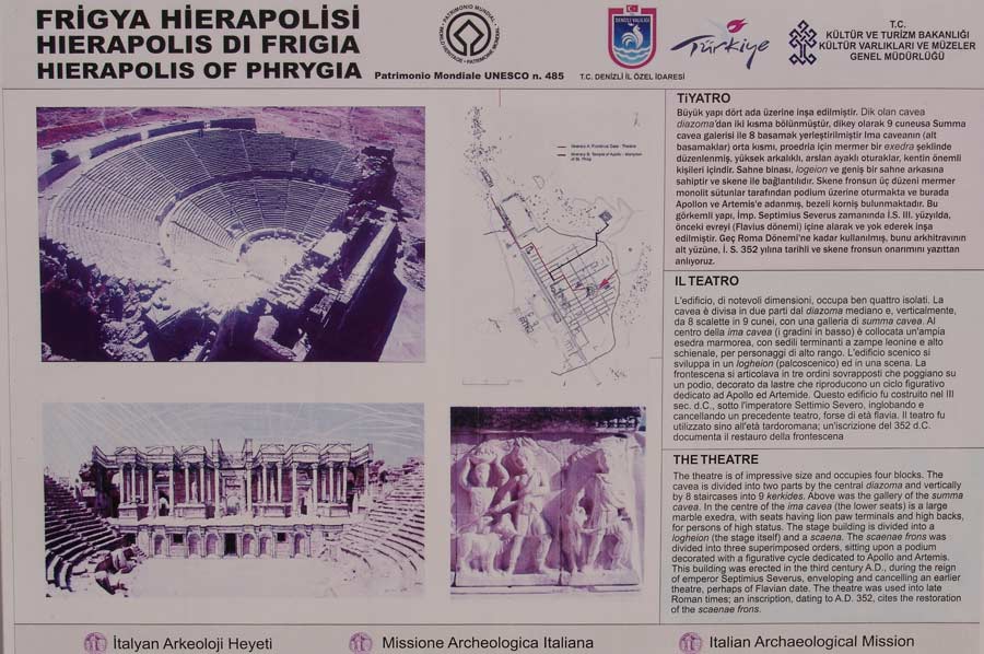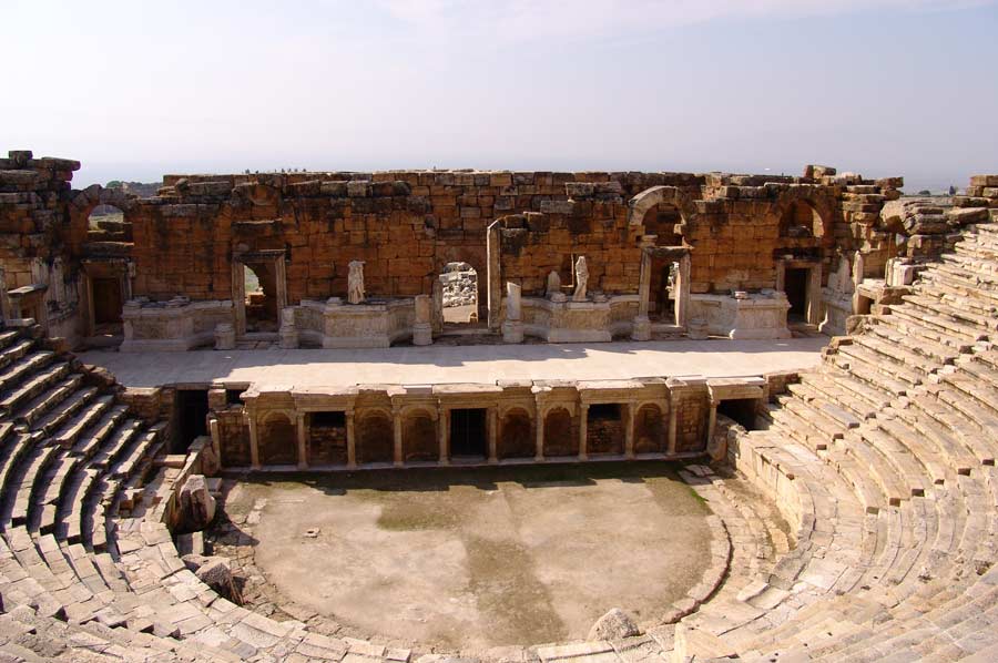Östlich der Agora von Hierapolis befindet sich, angelehnt an den Berghang, ein römisches Theater mit 50 Cavea und 2 Abteilungen. Dieses bot 15.000 Personen Platz, die Front des zweigeschossigen Bühnenhauses ist vollständig mit marmornen Reliefs verkleidet.