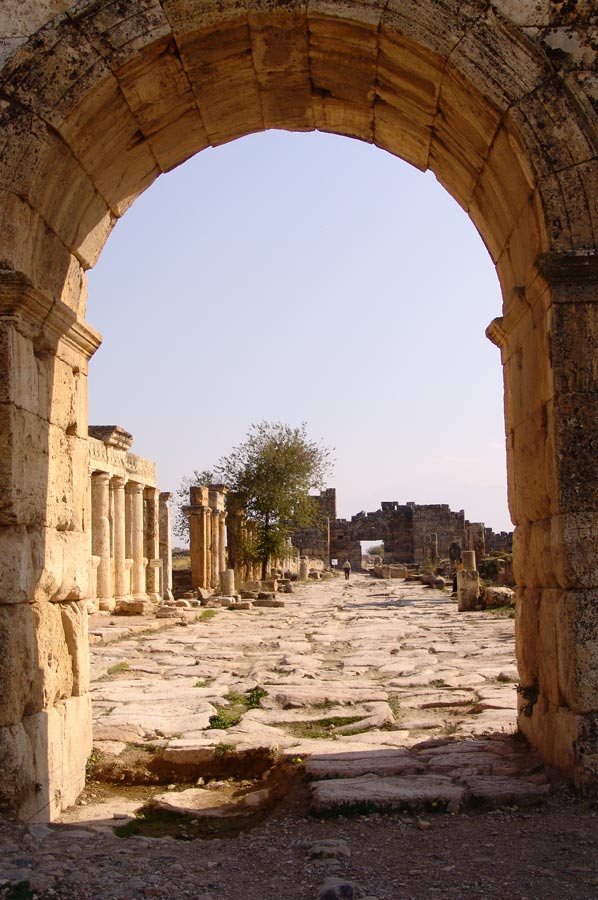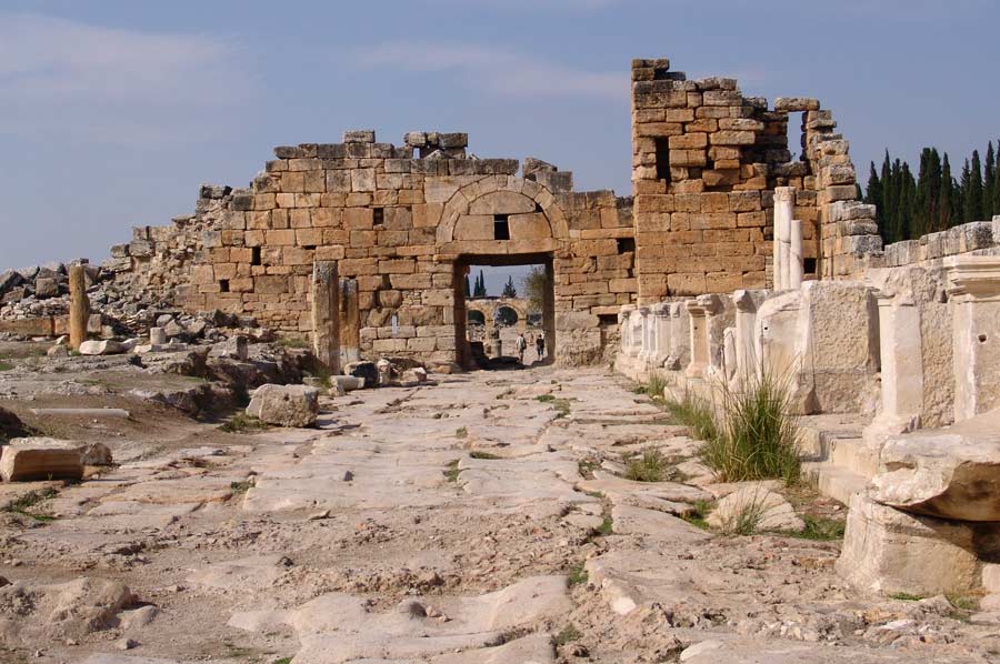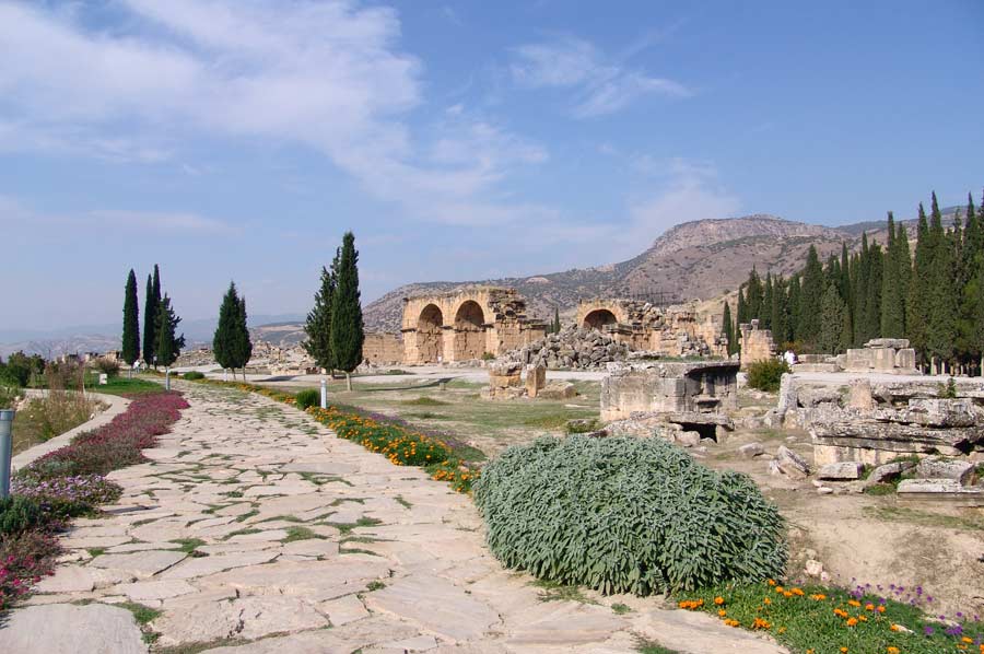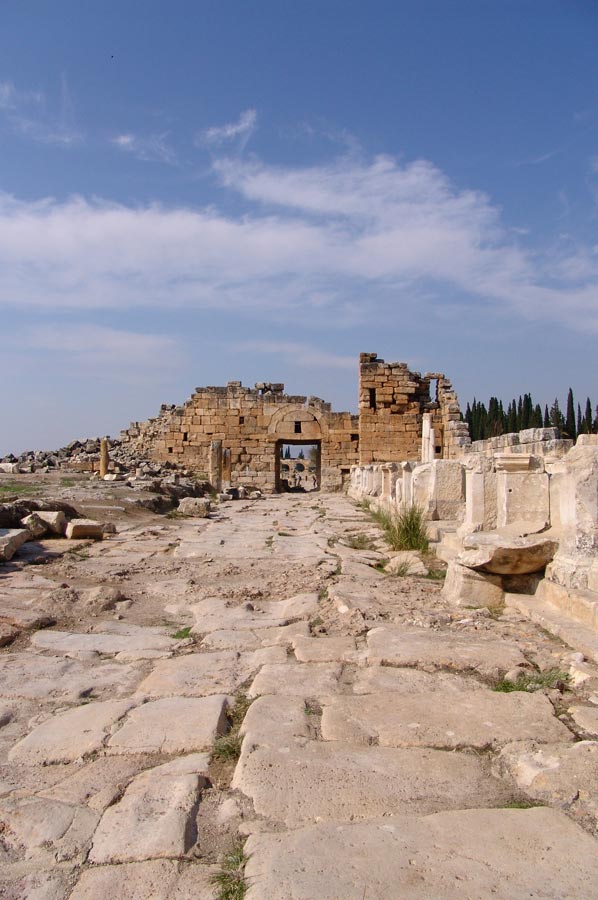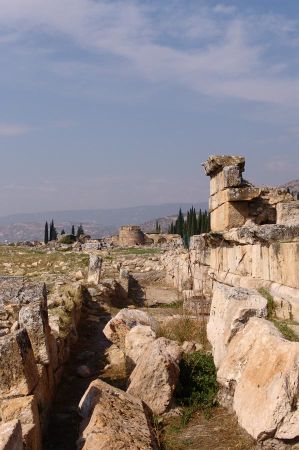 Hierapolis - Die Ruinen des antiken Hierapolis befinden sich entlang der 1200 m langen und 6m breiten säulenbestandenen Strasse, die sich auf dem Plateau über den Travertinterrassen von Pamukkale in Nordsüdrichtung erstreckt.