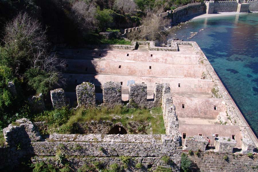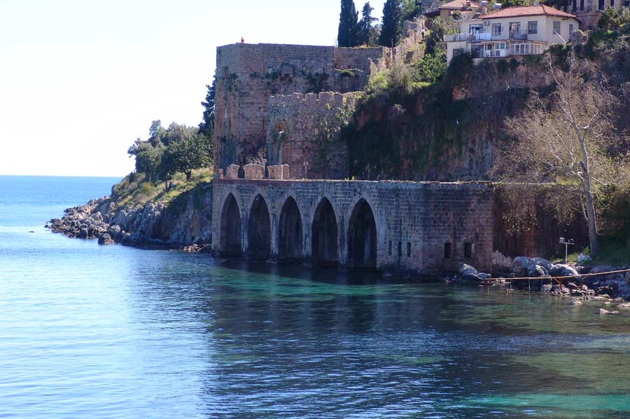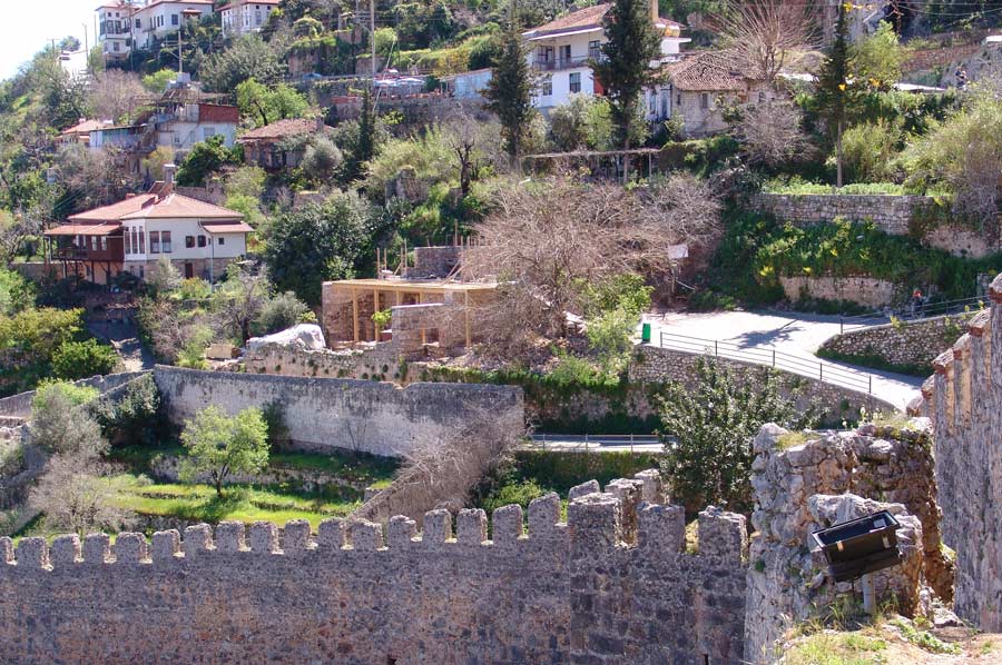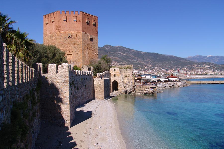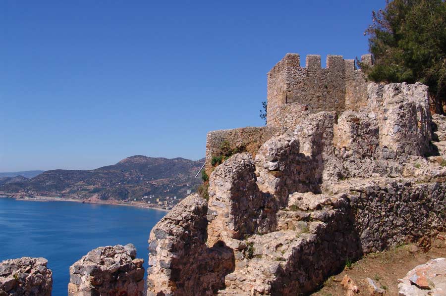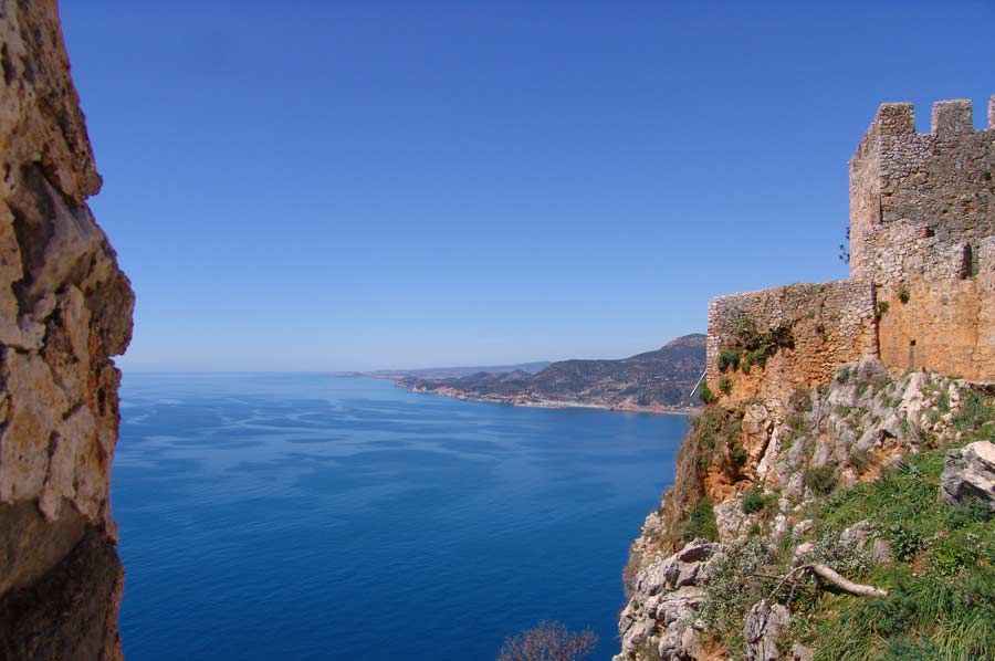 Ein paar kleine Cafes kann man auch entdecken, die zu einer Pause einladen. Der Tourismusandrang hält sich stark in Grenzen, so dass man entspannt die Ruhe genießen und die Umgebung auf sich einwirken lassen kann. Am Ende der Altstadt geht man auf die alten Mauern der Burgbefestigung zu. Von dieser Mauer hat man einen wunderbaren Ausblick auf Alanya und über das Meer. Das Meer funkelt, wenn die Wellen an den Felsen, auf dem sich die Mauer befindet, zerbrechen. Hier scheint das Meer türkisblau zu sein.