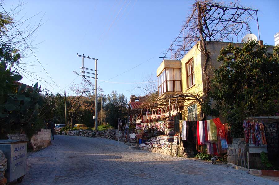 Wir durchquerten nun auf ansteigendem Pfad diesen ruhigen Teil der Altstadt und begeben uns dann auf die Hauptstraße, die direkt in vielen Windungen zur Burgruine hinauf führt. Hier ist es ratsam am Straßenrand entlang zu gehen, da regelmäßig Busse, Taxen und Autos die Straße hoch preschen, um Touristen zur Burg oder zu den Restaurants zu befördern, die auf diesem Weg liegen. In den Restaurants kann man direkt auf das Meer und Alanya blicken. Wir benötigten ca. 1 Stunde und 30 Minuten bis wir in das alte Dorf vor der Burg gelangten. Dazu muss gesagt werden, dass ein Jogger und ein rüstiges, älteres Ehepaar uns überholten. Im Dorf kommt man an mehreren Ständen vorbei, an denen meist ältere Frauen schöne handgefertigte Tücher, Schals und andere Souvenirs zum Verkauf anbieten, wobei die Preise sich moderat in Grenzen halten. Besonderes Interesse hatten wir an den in Handarbeit gestickten Tischläufern und Gardinen. Auch kleine Restaurants befinden sich im Dorf, die ansprechend aussehen und zum Verweilen und Speisen einladen.