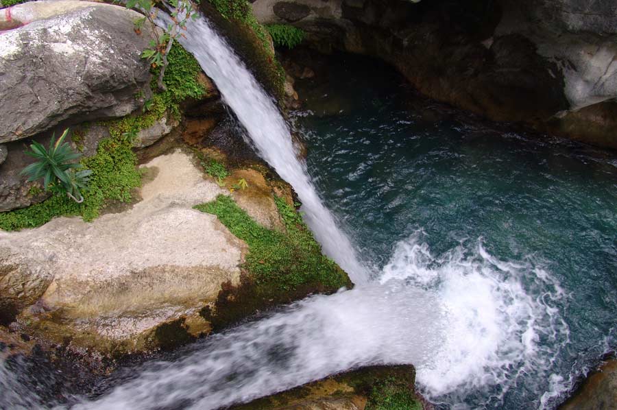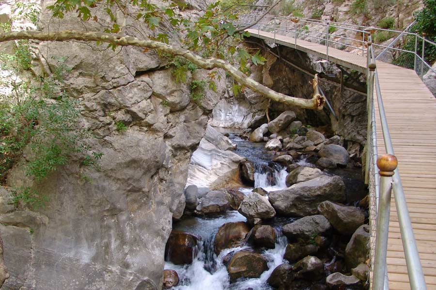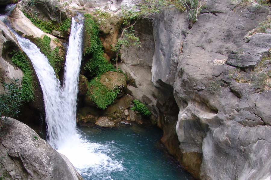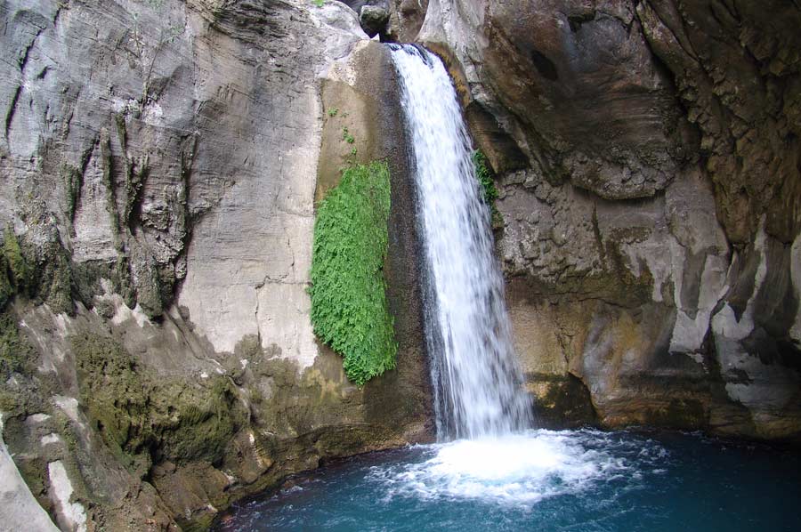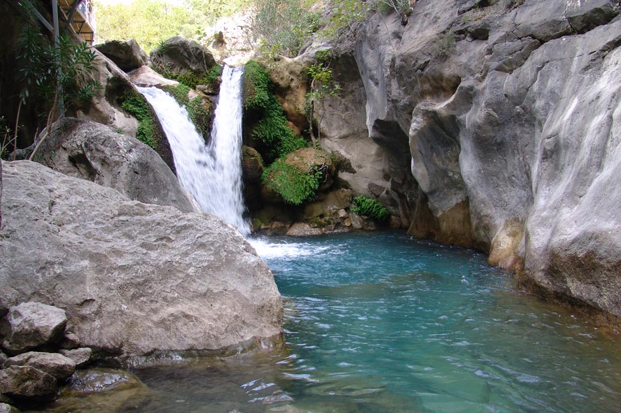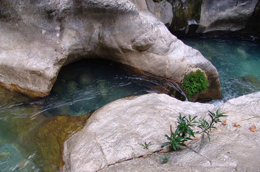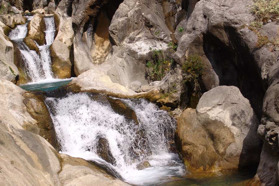 Im Canyon führen Treppen, an Stellen wo baden möglich ist, zum sprichwörtlich glasklaren Wasser hinab, so das man sich erfrischen kann! Und hier meinen wir wirkliche, echte Erfrischung, selbst in der heißesten Zeit des Sommers erreicht die Wassertemperatur kaum mehr als 12 Grad (gefühlt wie 0 Grad). Ganz am Ende des 600 Meter langen Trails befindet sich der größte der Wasserfälle, der auch wiederum eine Bademöglichkeit bietet! Verschiedene seltene Pflanzen gedeihen hier und Eidechsen sowie Singvögel leisten uns Gesellschaft! Immer wieder halten wir an und hören dem Vogelgezwitscher zu und beobachten die Libellen und Schmetterlinge über dem Wasser und an den Oleanderbüschen.