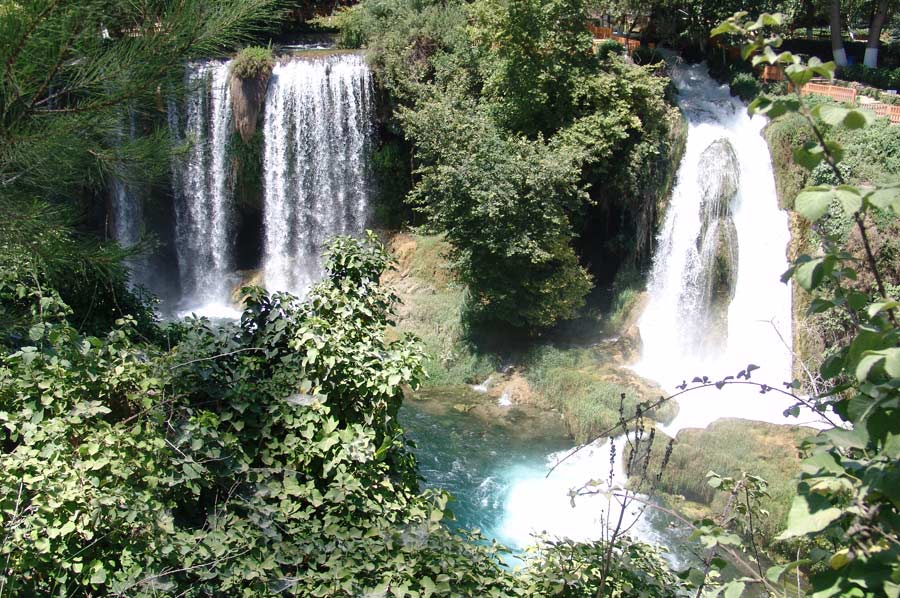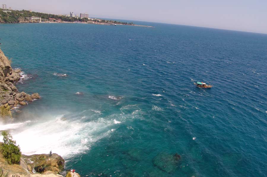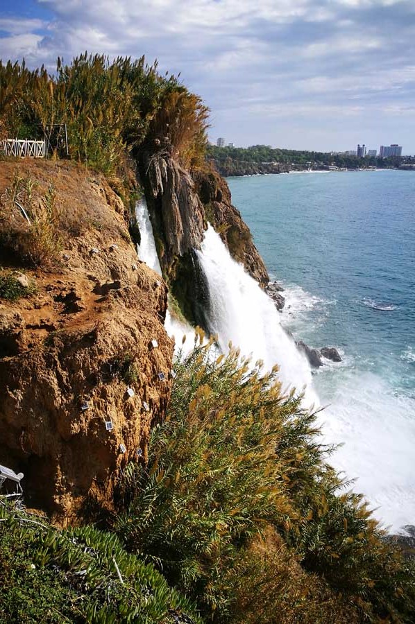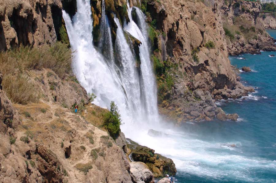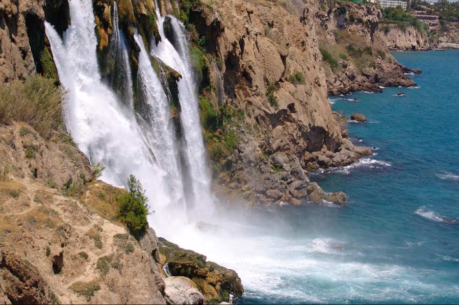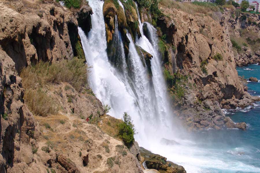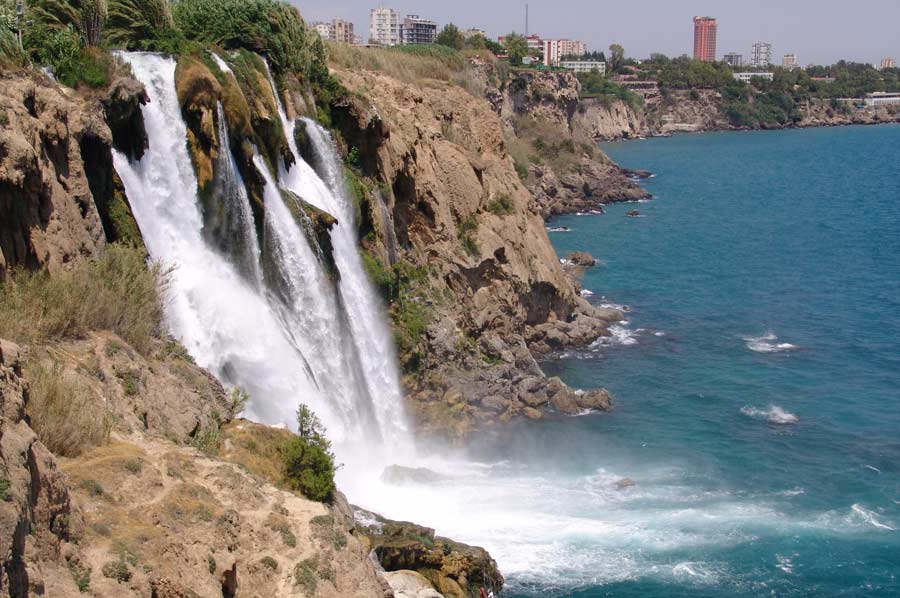 Der Düden fließt nun oberirdisch 14 km weiter und stürzt nach 14 km im Stadtteil Lara als "unterer Düden Wasserfall" oder auch "Lara Wasserfall" mit Getöse ins Meer. Fahren Sie auf der Strasse zum Flughafen links abbiegend Richtung Lara. Dann rechts abbiegend Richtung Antalya Zentrum an der wirklich sehenswerten Steilküste entlang bis zum Wasserfall. Mit riesigem Getöse fallen hier die Wassermassen ins Meer. Mit einem Ausflugsboot vom idyllischen Hafen von Antalya können Sie bis dicht an den Wasserfall gelangen.