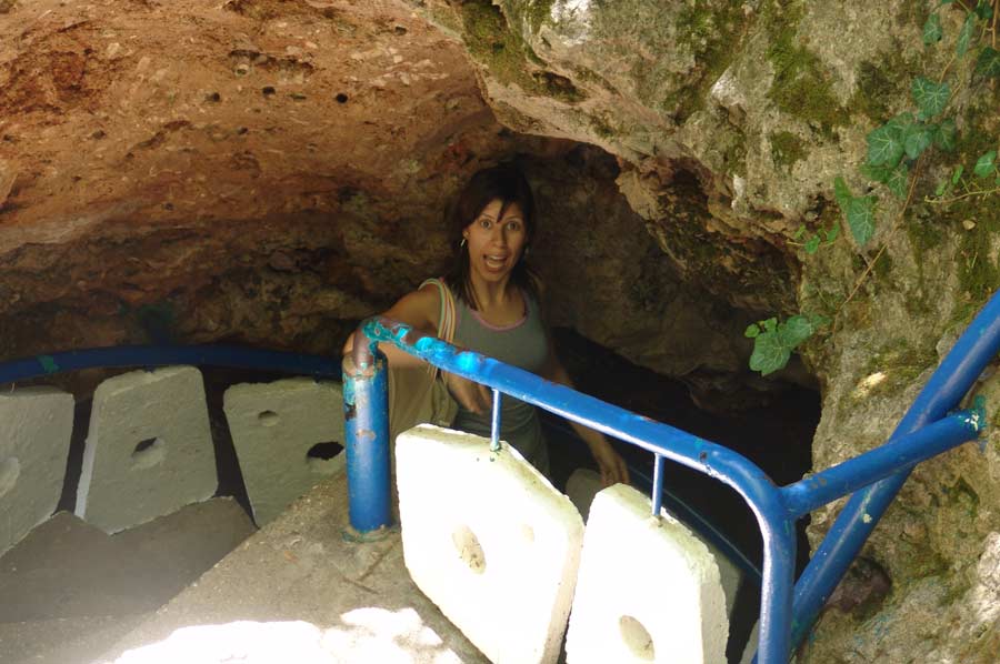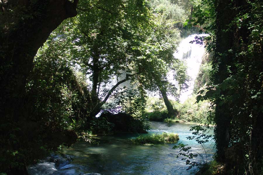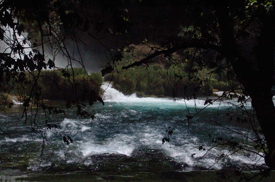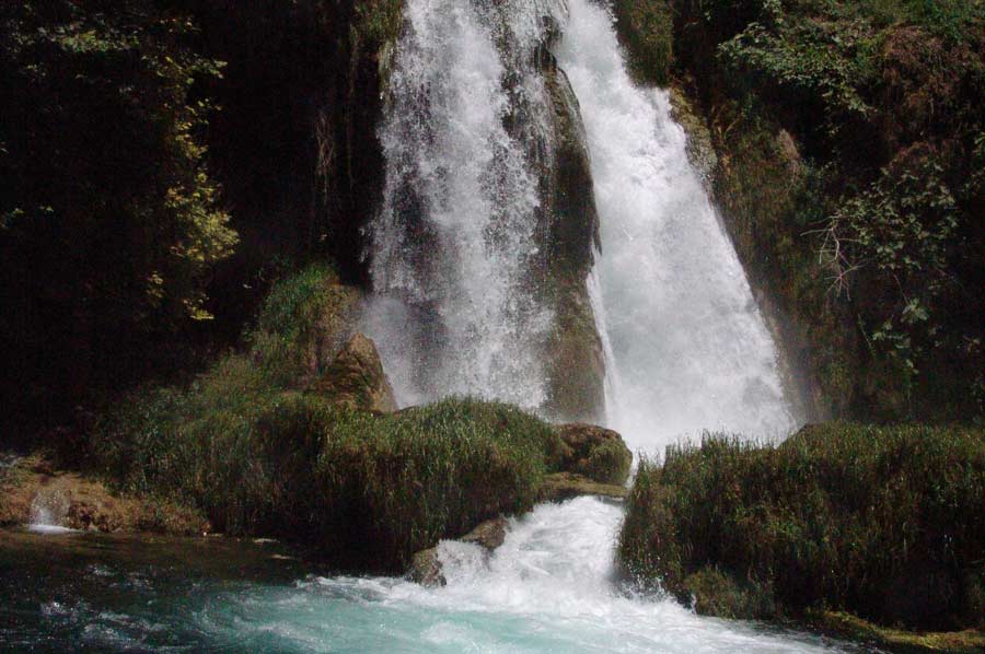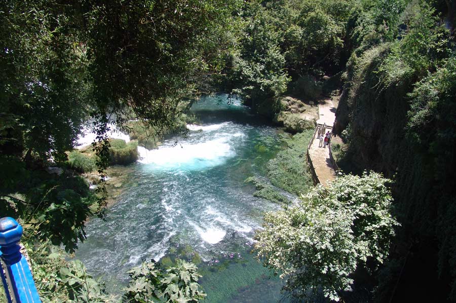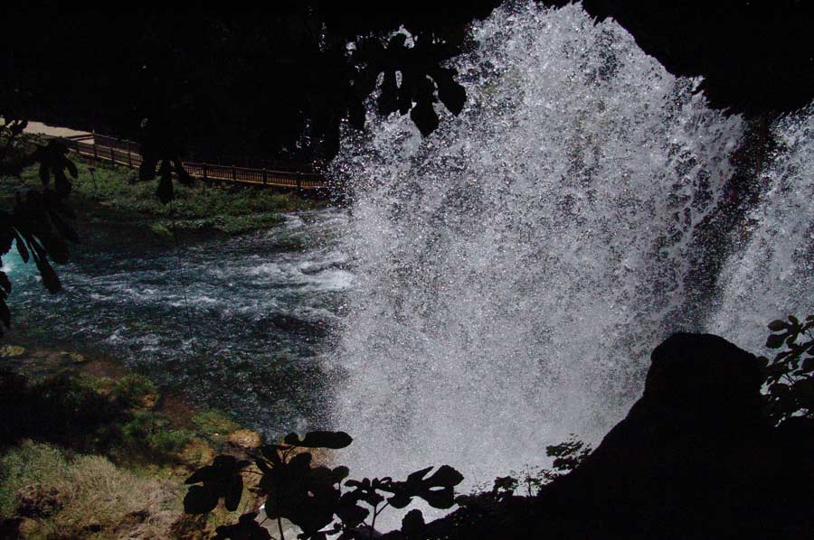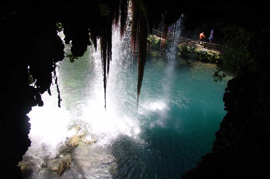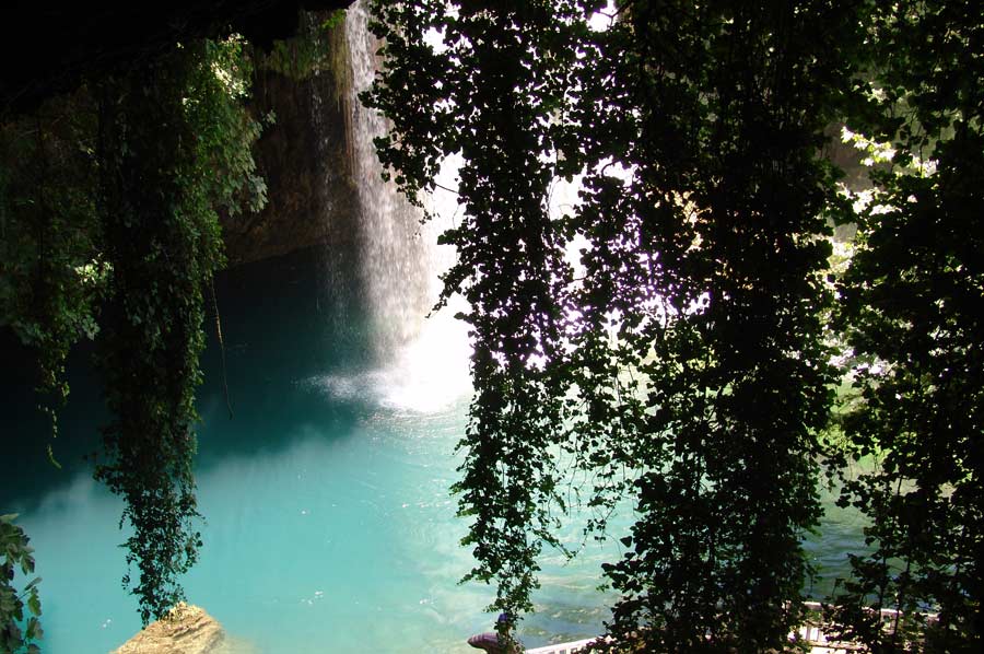 Der Höhepunkt während des Besuchs ist natürlich der große Wasserfall, der schätzungsweise 15 m hoch und 20 bis 25 m breit ist. Der Clou an der Sache ist der, dass der Spazierweg hinter dem Wasserfall in eine der Tuffhöhlen hinein führt. Es handelt sich im wesentlichen um Felsdächer, die dadurch entstanden sind, dass sich abgelagerter Kalktuff horizontal immer weiter angefügt hat, so dass das Wasser nun in einigem Abstand von der Felswand herabstürzt. Die besuchte Höhle besteht aus mehreren Kammern, die durch kurze Gänge verbunden sind. Einige dieser Durchgänge wurden aber offensichtlich künstlich durchgebrochen. Man kann aus einigen Gangfenstern von hinten auf den Waserfall schauen, was sehr reizvoll wirkt. Man verlässt die Höhle über eine eiserne Wendeltreppe, die in den oberen Bereich dieses Parks bei Antalya zurück führt. Die Gesamtlänge dieser Höhle dürfte ungefähr bei 40 m liegen.