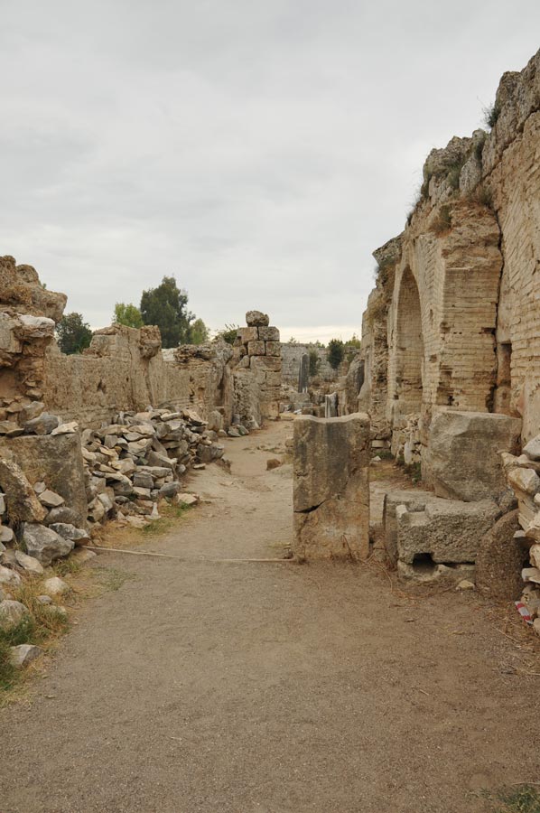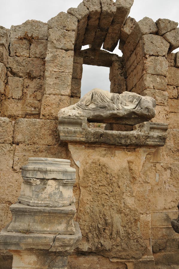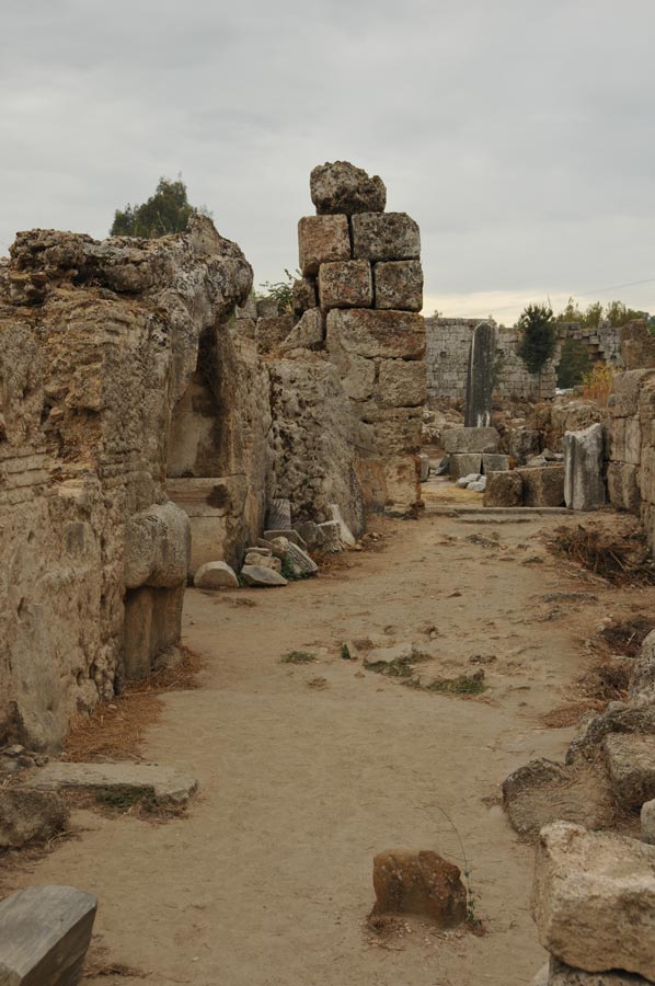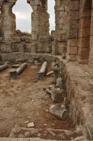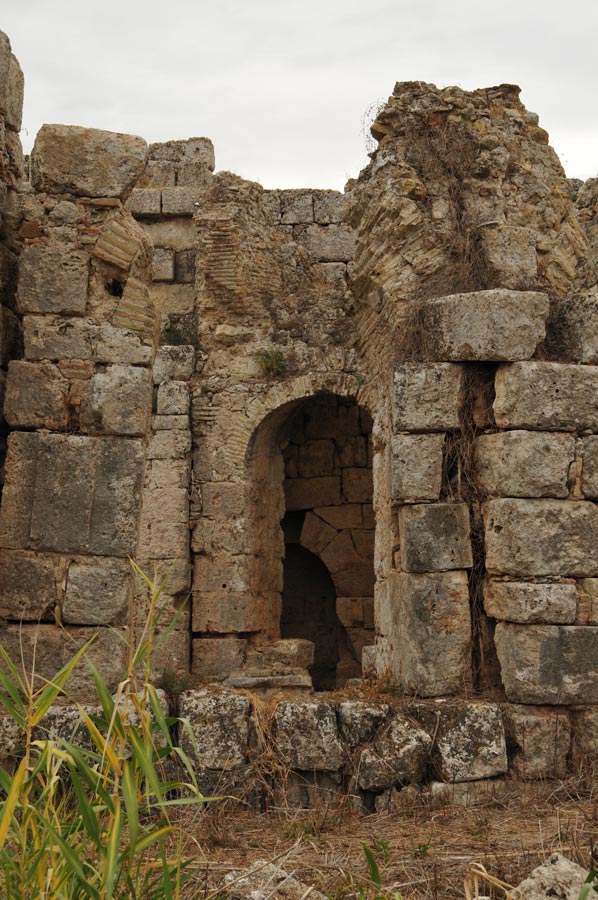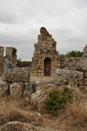 Aber in byzantinischer Zeit* begann der Niedergang, der Fluss versandete und die arabischen Piratenangriffe im 7. Jh. versetzten der Stadt den Todesstoß. Die Einwohner verzogen, viele nach Antalya, das eine stärkere Befestigung hatte, und die Stadt starb aus. Erdbeben legten die Stadt in Ruinen, und Überschwemmungen legten eine schützende Erdschicht über die Reste hinweg.