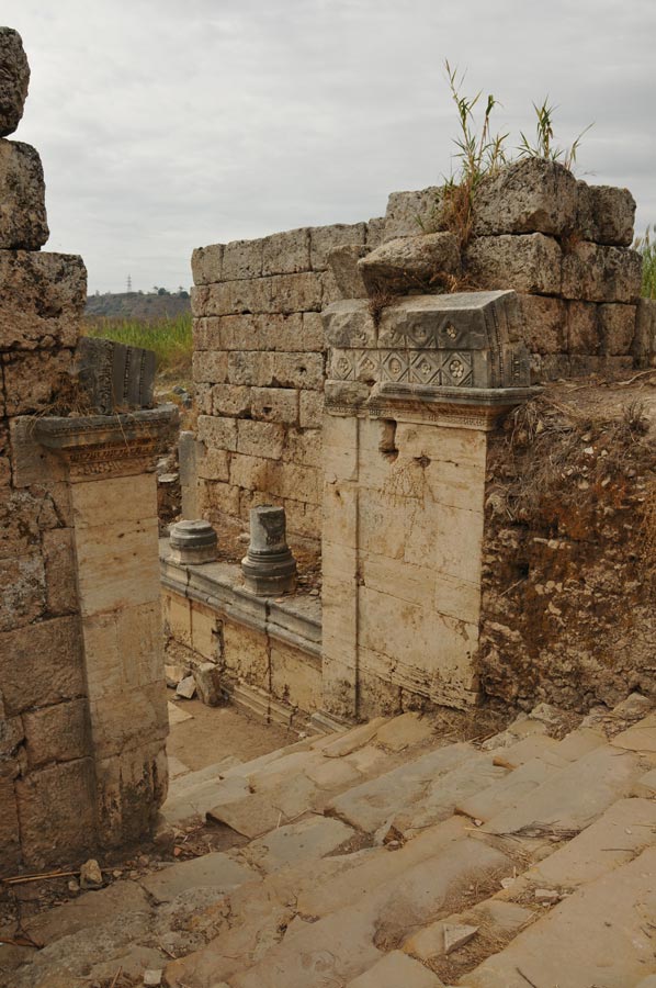 Dieses Tor ist reich ausgeschmückt gewesen, besonders auf der Nord-Seite. Durch das Tor von Perge kommt man auf einen 90 m langen Platz vor dem ursprünglichen hellenistischen Stadttor. Dieser Platz aus der Regierungszeit Kaiser Septimus Severus’ (193-211 n.Chr.) war für zeremonielle Zwecke, und ein Podium im westlichen Teil muss auch diesem Zweck gedient haben. Die südliche West-Seite ist mit einem monumentalen Springbrunnen ausgestattet, einem Nymphäum, mit einem großen Becken und dahinter eine zweigeschossige Fassadenmauer, die reich ausgeschmückt war. Eine Inschrift erzählt, dass das Nymphäum Arthemis, Kaiser Septimus Severus und seiner Gemahlin Julia Domna und ihren Söhnen Caracalla und Geta gewidmet war. Der Name und die Statue Getas wurden jedoch entfernt, als Kaiser Caracalla ihn 212 n.Chr. ermordete! Fragmente der Fassade mit Reliefs von Arthemis, Aphrodite und Nymphen sowie Marmorstatuen des Kaisers und der Kaiserin befinden sich nun im Museum von Antalya. Rechts vom Nymphäum führt eine monumentale Eingangspartie, ein sogenannter Propylon, in das römische Bad hinein. Über 2 x 4 Säulen lagen schwere Architravblöcke mit Reliefs.