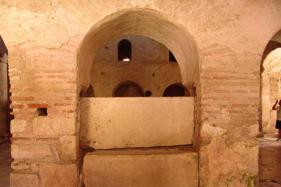 Sein Marmorsarkophag befindet sich in der Kirche, aber seine sterblichen Reste wurden im 11. Jahrhundert von Piraten nach Bari an der italienischen Adriaküste verschleppt, wo sie in einer nach ihm benannten Kirche beigesetzt wurden.