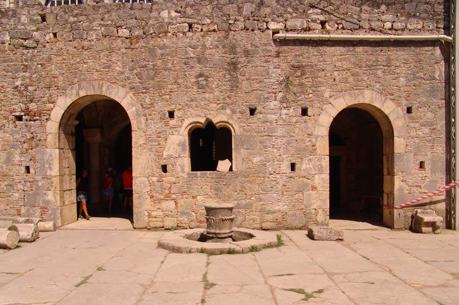 Im Hof steht eine Statue des von Kindern umringten Heiligen.