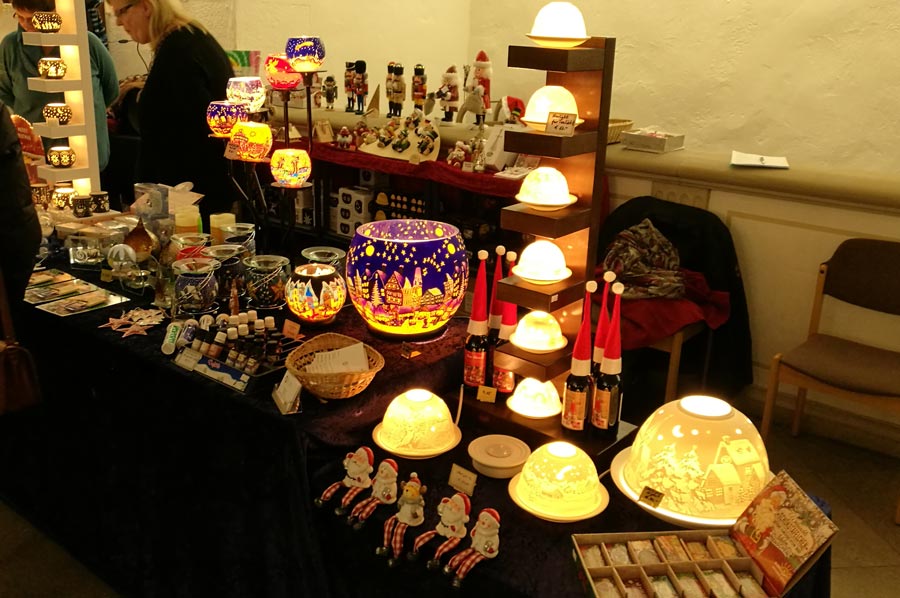 Und so konnten auch wir uns am Samstag zum frühen Abend auf den Weg über die Alte Mainbrücke nach Kitzingen hinein machen, um dem Treiben am Markt beizuwohnen. Einmal mehr die Präsentation der örtlichen Anbieter von Weihnachtsdekoration an Christbaumschmuck, selbst gefertigten Kerzen und diversen Holzarbeiten, die wohl am häufigsten frequentiert wurden. Hier fielen uns auch einige handgemalte Bilder auf, die sich mit der historischen Vergangenheit der Stadt auseinandersetzten.