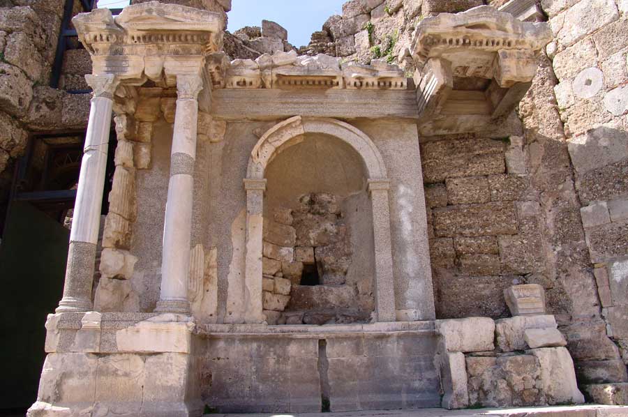 Nicht weit vom Ixion-Relief steht eine Statue des Flussgottes, der den Melas-Fluss, den heutigen Manavgat, der symbolisch aus einem Behälter unter seinem Arm herausläuft, personifiziert. Damals sah man die Flüsse und Wasserläufe, die den Städten leben gaben, als Götter an, und sie wurden in der Regel als zurückgelehnte und ruhende Mannesfiguren abgebildet.