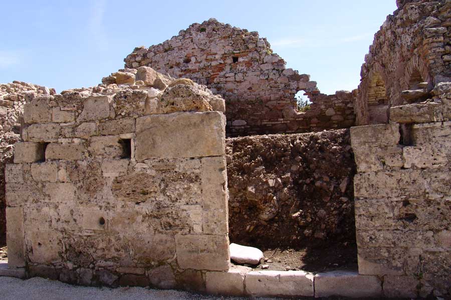Der Eingang war im Nordwesten dem Wasser zu, wo auch ein von Säulen gesäumter Sportplatz, der jetzt ein Garten ist, lag. Durch diesen Eingang kam man in die kalten Bäder, Frigidarium (b), von dort zum Schwitzraum, Sudatorium (Dampfbad) (c). Der dritte und größte Raum waren die warmen Bäder, Caldarium (d), mit Zentralheizung unter dem Fußboden. Von hier kam man durch eine schmale Tür in den weniger warmen Wasch- und Übergangsraum, Tepidarium (e), wo man sich zwischen den warmen und kalten Bädern aufhalten konnte. Alle fünf Räume waren ursprünglich gewölbt, aber nur drei von ihnen sind im Zusammenhang mit der Restaurierung überdacht worden. Das Gebäude wurde im 5. Jh. n.Chr. aufgeführt und waren ursprünglich mit Marmor bekleidet. Vermutlich hat das Gebäude die zwei römischen Bäder, die im Hafenviertel, außerhalb der neuen Stadtmauer, die im 4. Jh. gebaut wurde, lagen, ersetzt. Irgendwann hat man aufgehört, die Bäder zu benutzen, vielleicht weil die Wasserversorgung ausblieb, oder weil man die enormen Mengen Holz, die zur Heizung benötigt wurden, nicht aufbringen konnte. Anstelle hat man das Gebäude als Beerdigungsstätte gebraucht. Ein paar ausgestellte Skelette mit intakten Zähnen zeugen hiervon (im Caldarium).