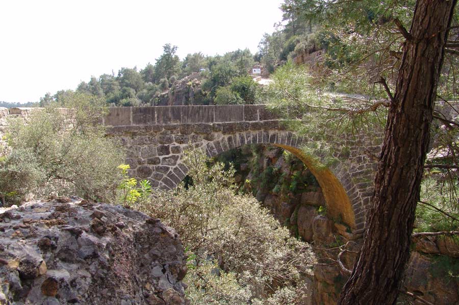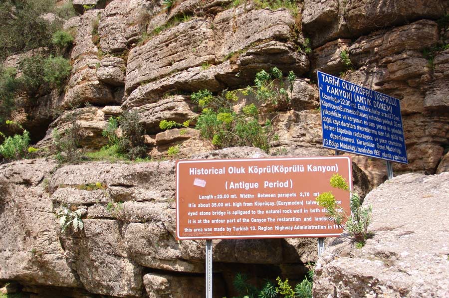Wir verlassen die Rafting Abenteurer und setzen den Weg entlang des Köprülü Flusses fort. Wenig später treffen wir auch eine der uralten Brücken, die früher eine Passage des Canyons erlaubten. Eine weitere Brücke geht auf römische Baufachleute zurück, die bis heute zumindest für PKW Verkehr noch nutzbar ist. Aufgrund von Versuchen, mit dem LKW die Brücke zu passieren, hat man während der Renovierungsarbeiten die Durchfahrtsbreite reduziert.