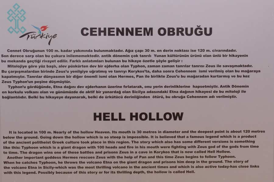 Die "Hölle" Cehennem befindet sich ungefähr 75 m nördlich des "Himmels" Cennet. Die steilen Wände, die auf eine Tiefe von 120 m fallen und zu den Außenkanten nach unten breiter werden, lassen einen gefahrlosen Abstieg nicht zu, so daß die "Hölle" nicht betreten werden kann. Lediglich von einem Podest aus, das über den Rand der Höhle hinaus ragt, ist der Blick in die Hölle möglich.