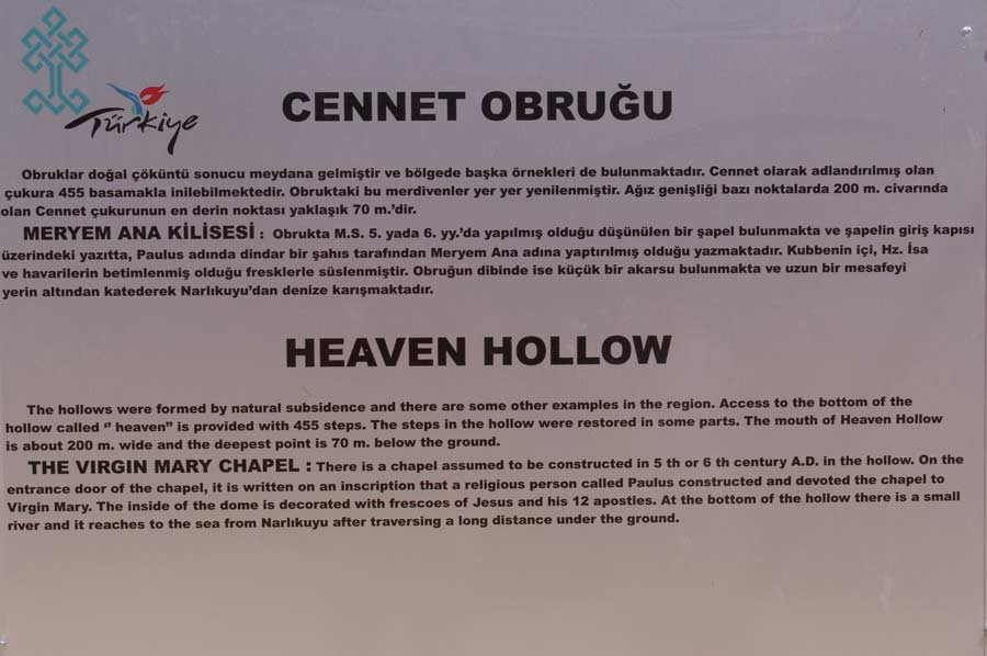 Die erst 1852 entdeckte Karstschlucht "Himmel" Cennet ist die größte der vier Korykischen Grotten. Cennet ist eine nur zur Hälfte eingebrochene Höhle, die auch als Heiligtum des Zeus Olbius diente, dessen Kult in den Jahrhunderten vor Christus die gesamte Region beherrschte.