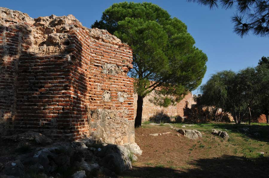 Die noch bestehenden Teile der mächtigen Festung wurde allerdings von den Seldschuken erbaut. Die äußere Stadtmauer beginnt beim Roten Turm und führt, in Übereinstimmung mit der Landverteidigungslinie, nach einem wohlüberlegten Plan zum Ehmedek, der Inneren Burg, dem Hinrichtungsturm, oberhalb der Cilvarda Felsnase und unterhalb des Leuchtturms entlang weiter zum Arap Evliyasi (Kapelle) und dem Ostturm. Zieht sich dann hinunter nach Tophane und der Werft im Norden und endet an ihrem Ausgangspunkt, dem Roten Turm. Die Mauer erstreckt sich über eine Gesamtlänge von 6.500 Meter.