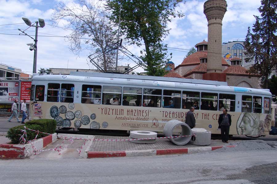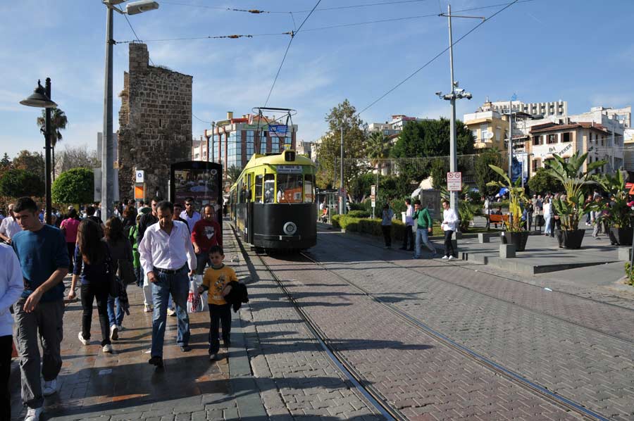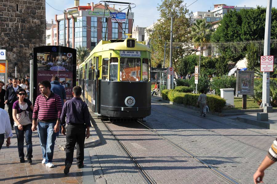 Auf einem parallel zur Küstenlinie verlaufenden Gleistrakt wurde im Jahr 1999 ein etwa fünf Kilometer langes Teilstück der Straßenbahn Antalya frei gegeben. Von der Endhaltestelle Zerdalilik im Süden der Stadt geht es 10 Haltestellen passierend bis zur westlichen Endhaltestrecke Müze, dem archäologischen Museum der Stadt Antalya.