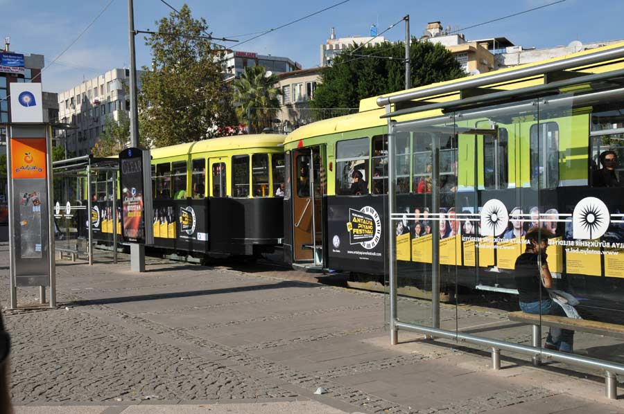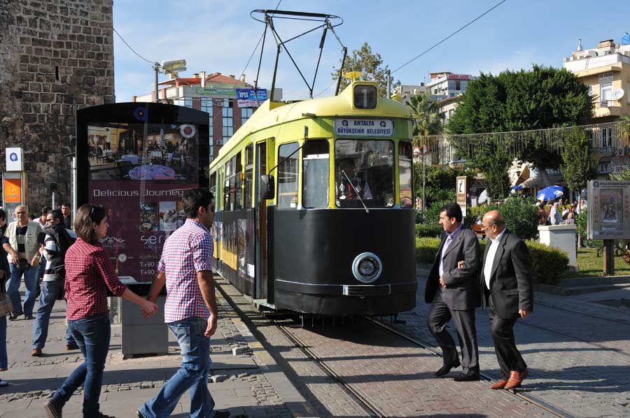 Fast alle Wagen sind im Originalzustand erhalten, verfügen über die klassischen Holzbänke und waren als Geschenk der Partnerstadt Nürnberg herzlich willkommen. Heute sind drei Triebwagen mit je einem Anhänger, entsprechend von 1 – 6 nummeriert, im halbstündigen Einsatz. Den an einigen Stellen angebrachten Fahrplan sollte man eher nur als Anhaltspunkt betrachten, denn oft genug ordnet sich die Straßenbahn dem Antalya Stadtverkehr unter. Die Bahn fährt aufgrund des starken Verkehrs, besonders auch der die Gleise passierenden Fußgänger, recht langsam, bietet damit natürlich den Nutzern auch die Möglichkeit der beschaulichen Stadtrundfahrt.