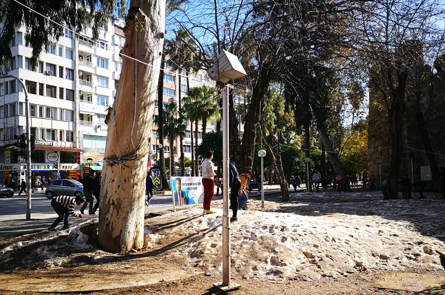Östlich vor dem Tor und der alten Stadtmauer verläuft die breite Atatürkstraße, die durch eine Doppelreihe von stattlichen Dattelpalmen in zwei Fahrbahnhälften geteilt ist. Sie führt in einem weiten Bogen südwärts zum Rathaus, hinter dem sich der besuchenswerte Stadtpark bis zum hohen Kliffrand über dem Golf ausdehnt. Der Park bietet eine üppige subtropische Flora, schöne Spazierwege und nicht zuletzt prächtige Ausblicke vom Stadtkliff über den Golf mit dem Strand Konyaalti und dem neuen Seehafen am fernen Ufer bis zu der gewaltigen Bergkulisse des Lykischen Taurus; ferner gibt es hier diverse Gast- und Vergnügungsstätten sowie Picknick und Spielplätze.
