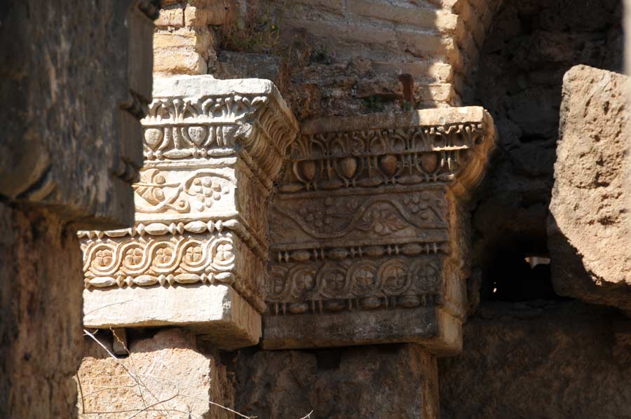 Die Bogenwölbungen selbst sind mit eingelegten, flachen Kassetten verziert, die jeweils von Eierstäben gefasste Rosetten- und Blütenornamente enthalten. Die mittleren Pylone des Tores sind so schmal, dass die Archivolten der von ihnen getragenen Bögen aneinanderstoßen. Die demgegenüber breiteren äußeren Pylone enden in flachen Antenpfeilern mit entsprechenden Antenkapitellen.