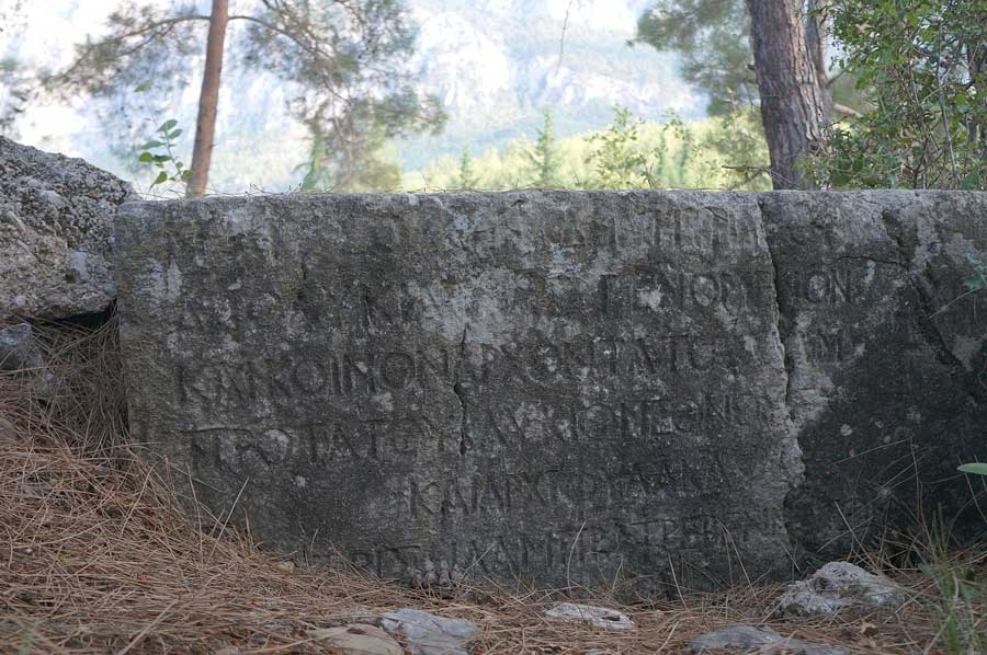 Wir erklimmen den Hügel, auf dem die Ruinen der Stadt liegen. Reste einer ehemals wohl umfassenden Stadtmauer aus frühbyzantinischer Zeit empfangen uns auf dem Weg zur Hügelanhöhe. In die Wehrmauer sind, wie seiner Zeit üblich, unzählige Spolien ehemaliger Gebäude, Säulenreste, Kapitelle, ja sogar Sarkophagteile aus Trebenna mit eingearbeitet worden, wie sich an Hand der unzähligen Inschriften auf den Spolien entnehmen lässt. Neben den Ruinen römischer Bäder treffen wir auch auf die Ruinen einer frühbyzantinischen Basilika. Weiter ansteigend, fast schon oberhalb der Stadtruinen stoßen wir auf eine Akropolis, die wohl zu mittelbyzantinischer Zeit als Befestigungsanlage ausgebaut worden war. Eine weitere byzantinische Einraumkirche liegt in unmittelbarer Nähe.