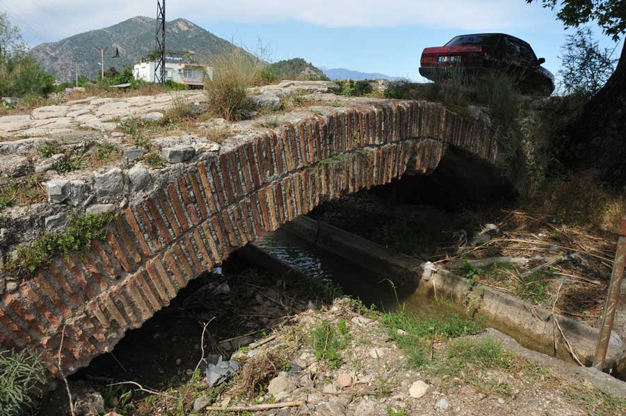 b_450_450_16777215_00_images_turkey_turkish_riviera_antalya_DET_2864.jpgDie Brückenbögen wurden mit lokal geschlagenen Kalksteinblöcken und einer Mörtelverbindung aufgemauert, während der Brückenkörper als Gussmörtelmauerwerk mit Bruchsteinen errichtet wurde, das mittlerweile an vielen Stellen durch die stark angegriffene Außenverkleidung freiliegt. Der Mörtel besteht aus hartem Kalk mit Feinkies versetzt. Die Pflasterung der Fahrbahn ist gänzlich verschwunden, wobei das gleichmäßige Gefälle der Brückenrampe darauf hindeutet, dass das antike Pflaster der heutigen Oberfläche direkt auflag.