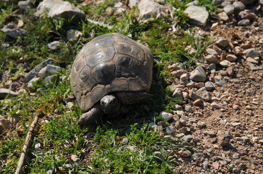 So erkunden wir selbst, gehen einigen Hinweisen nach und finden dann auch tatsächlich den markierten Einstieg in die Passage, die über das Gebirge führt. Zunächst über relativ einfach zu erwandernde Feldwege, wird der Weg schnell enger und steiler, bis es tatsächlich nur noch ein Ziegenpfad ist. Höher und höher geht es hinauf.