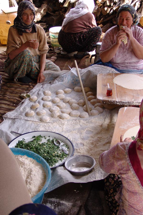 Unterwegs bemerkten wir unter einem Verandadach Frauen, die zusammen saßen, munter plauderten, Tee tranken, Brotfladen für das ganze Dorf buken und besonders Gözleme zubereiteten. Die eine Frau knetete den Teig, die nächste formte Bällchen daraus, die von einer dritten auf einem Holzbrett zu runden Teigfladen ausgerollt wurden.