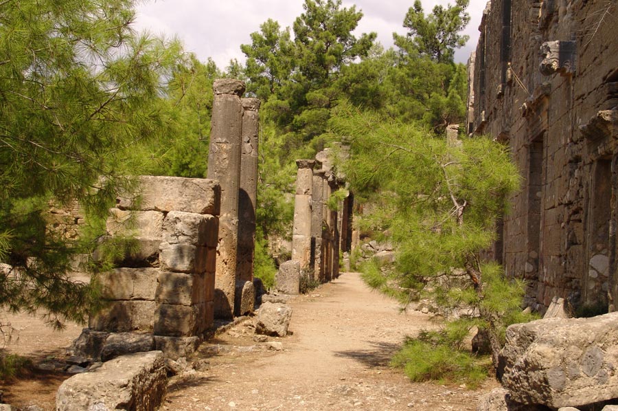Wir folgen einem verschlungenem Weg durch wunderschöne Pinienwälder und gelangen zur Ruinenstadt Seleukeia , etwa 12 Kilometer Entfernung nordwestlich von Manavgat, die einen wunderschönen Panoramablick in das Taurus Gebirge und bis zur Küste gestattet.