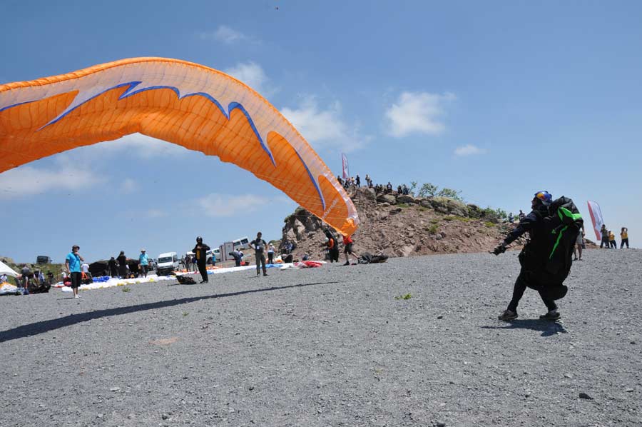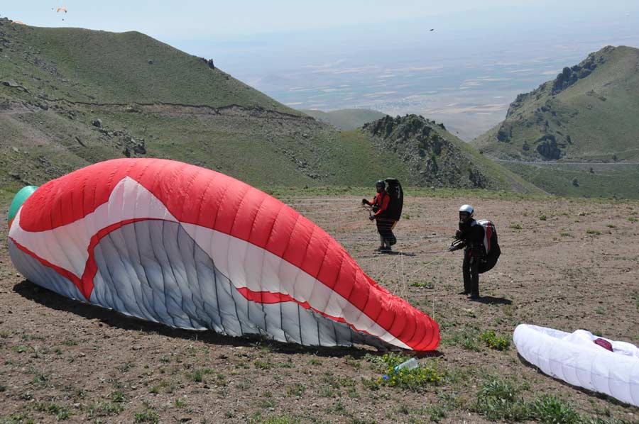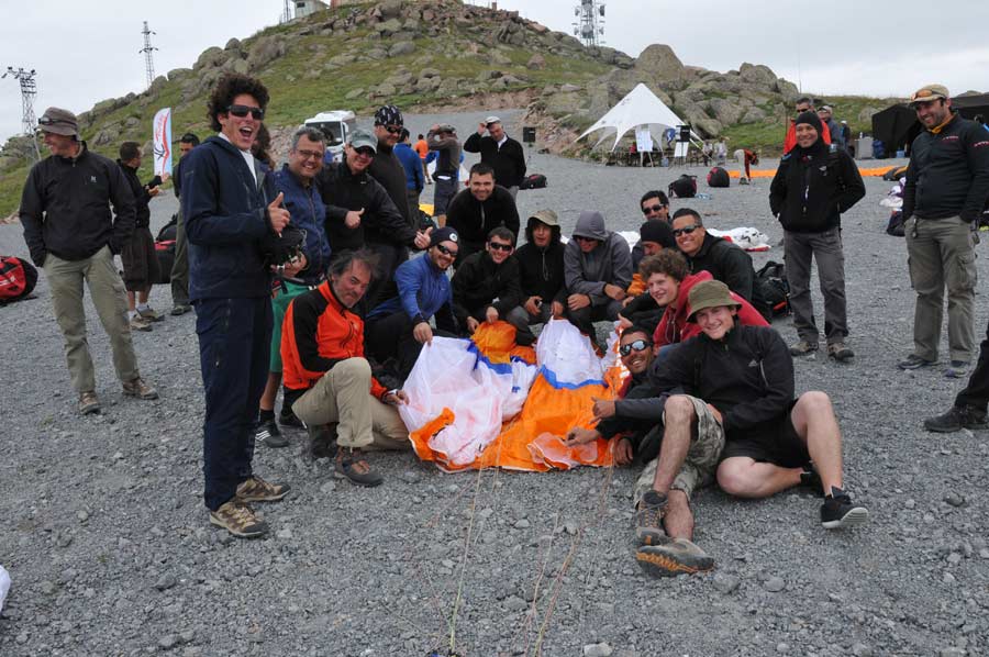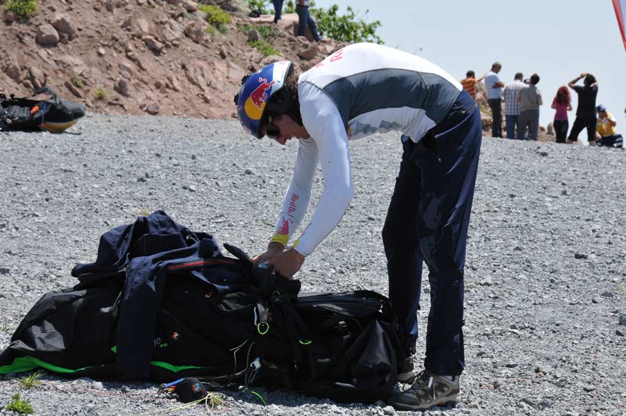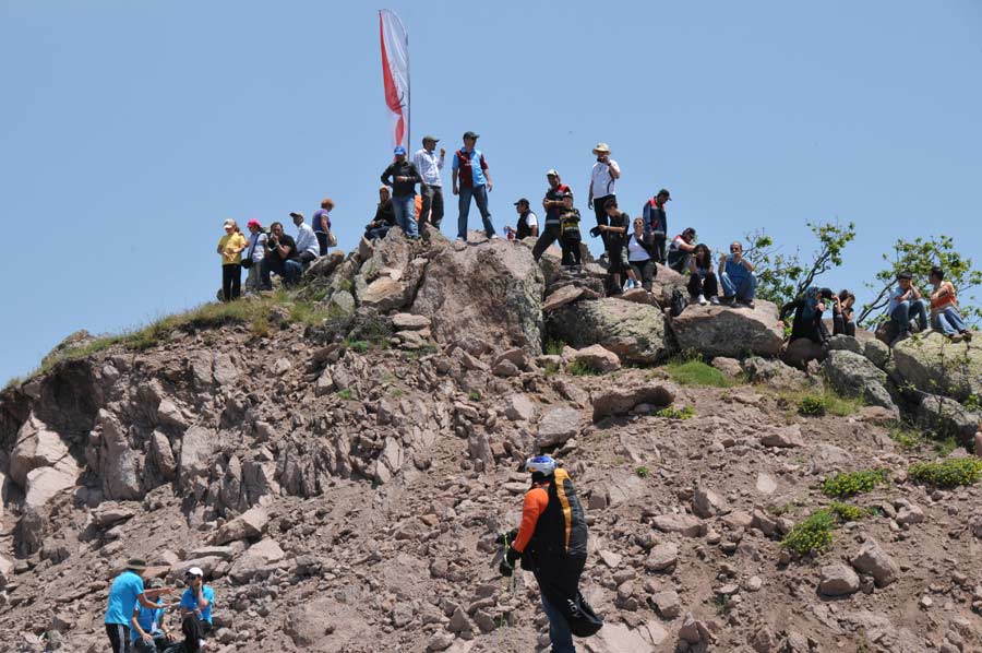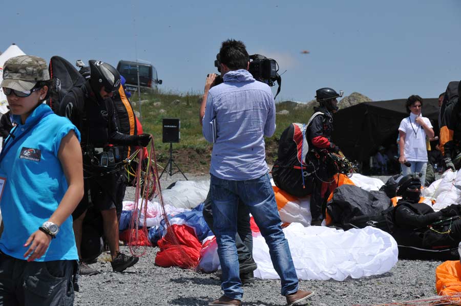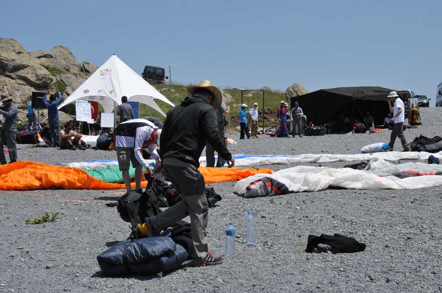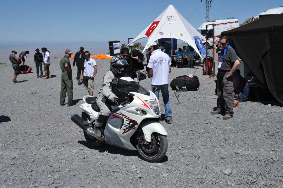Am nächsten Morgen zum Frühstück waren dann etliche Gäste neben den Piloten und dem technischen Team im Hotel anwesend. Aufgrund der großvolumigen Motorräder aus Deutschland, die nun vor dem Hotel parkten, war auch ein interessierter türkischer Motorradfahrer zum Frühstück gekommen und mit Cevdet in tiefe Gespräche verwickelt. Pünktlich um 9.00 Uhr fuhren wir dann mit unseren Fahrzeugen Richtung Karadag. In Begleitung unserer Motorradgruppe erregten wir schon auf dem Weg durch die Stadt viel Aufmerksamkeit. Am Startplatz angekommen wurden schnell die Technik zur Funküberwachung, zur Pilotenerfassung sowie alle weiteren zum Start notwendigen Einrichtungen hergestellt. Kurze Zeit darauf kam dann der Gouverneur von Karaman im Dienstfahrzeug mit großem Gefolge zum Startplatz. Nach kurzen Einführungen und Erläuterungen durch die Veranstalter, zu dem sich zwischenzeitig auch die Toppiloten Pal Takats und Patrik Andre gesellten, wurden durch eine einführende Rede der Wettkampf offiziell eröffnet. Da es zunächst noch ungünstige Windbedingungen am Südstartplatz gab, wechselten wir zum Nordstartplatz über und nach und nach starteten die Piloten in den ersten Wettkampftag. Gegen Abend wurde Pal Takats mit einer Weite von 116 Kilometern als Tagessieger festgestellt.